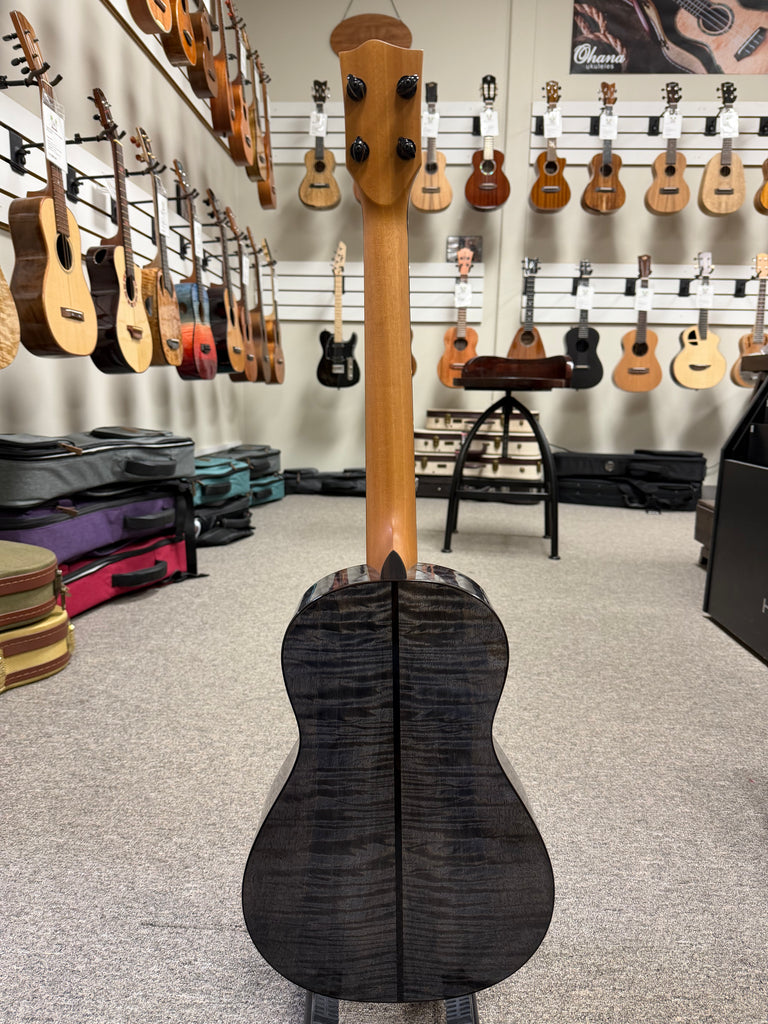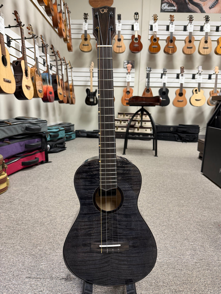 The ’Oli L2-BMG-BK black mango baritone ukulele is a beautifully crafted instrument that combines rich tonewoods with refined playability, making it a standout choice for serious players and collectors alike. Its body is constructed from solid mango wood—renowned for its warm, resonant voice and visually striking grain—accented with elegant black ebony binding that highlights the instrument’s sleek, dark aesthetic. The gloss black finish on the body contrasts with a comfortable satin-finished neck, while the ebony fingerboard and bridge add depth to both feel and appearance. Thoughtful touches like a radius fretboard, bone nut and saddle, quality Gotoh UPT tuners, and a side sound port enhance playability and projection, delivering a full-bodied, expressive tone that responds beautifully to both strumming and fingerstyle techniques. Complete with a robust hardshell case, this baritone uke sounds and good as it looks.