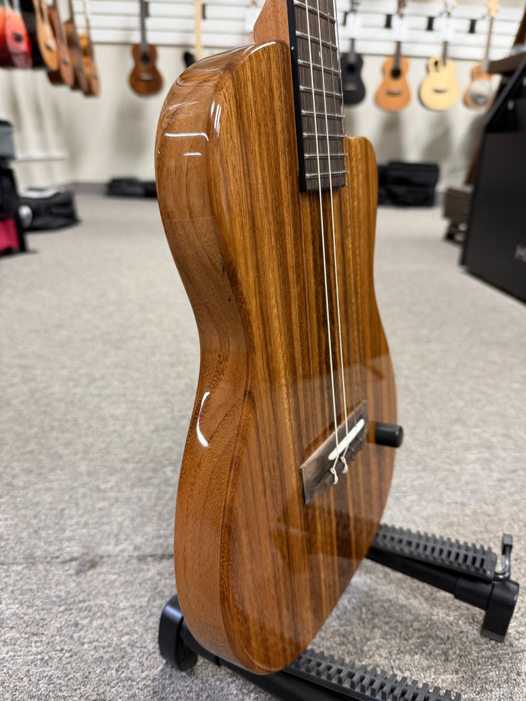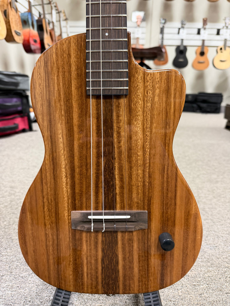 This amazing solid body electric uke features a solid chambered acacia body and a passive Pono pickup. A simple volume knob is all you need to unleash the beauty of this electric uke. Feedback is not an issue with the chambered body which is why this model is preferred by a lot of performing musicians. The rosewood fingerboard on the radiused fretboard provides an ultra smooth playing experience. Aloha !!