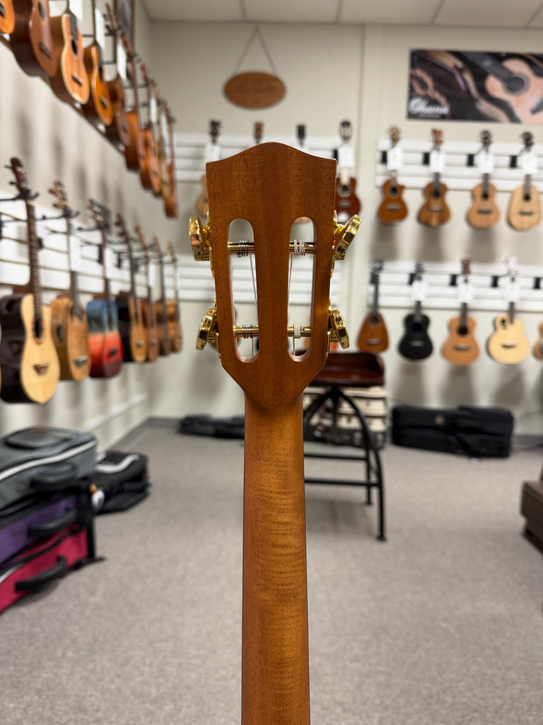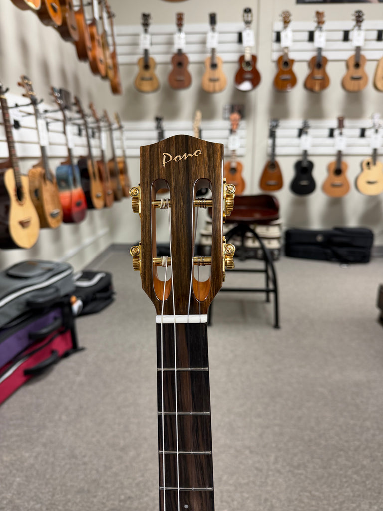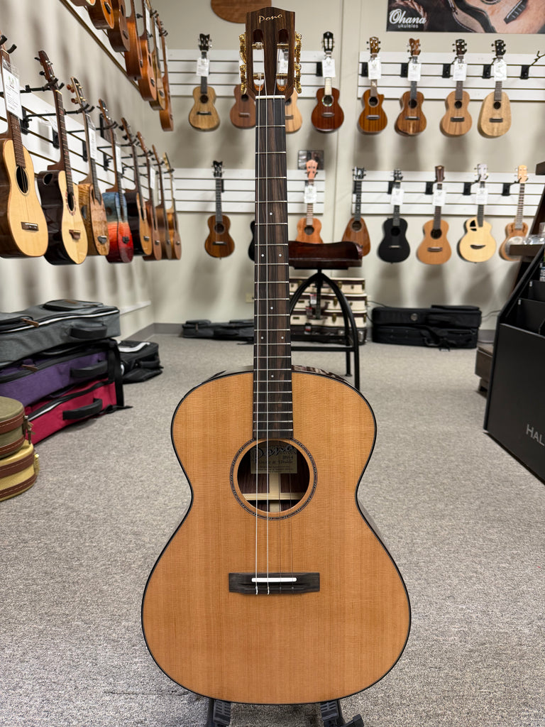 This big body baritone ukulele from Pono is really an amazing instrument. It's basically a tenor guitar that is set up with nylon strings and tuned D G B E. The large solid cedar and rosewood body provides a big, warm beautiful sound while the nylon strings are nice and easy on the fingers. Comes with a Pono padded case.