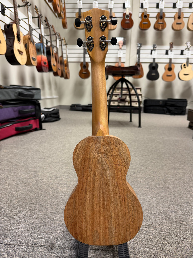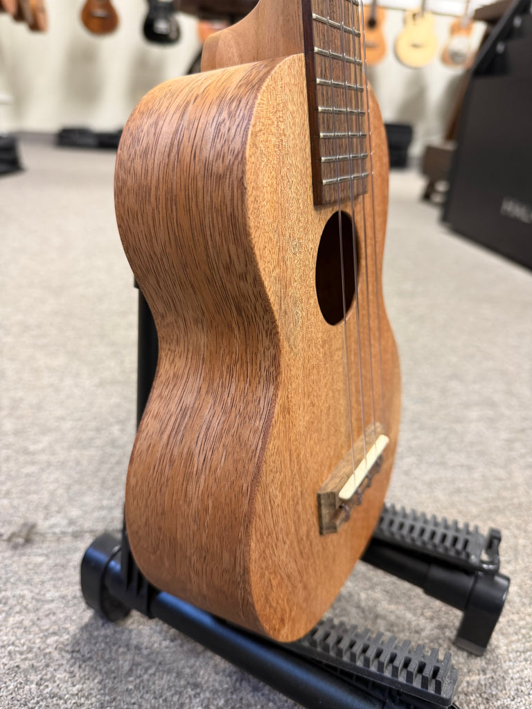 Great little soprano from Pono Ukuleles. This one features an all solid mango body to go along with the merbau bridge and fingerboard. The tone is very warm and classic Hawaiian ukulele sounding. The action is also great making it easy to play for hours. Aloha to that !!