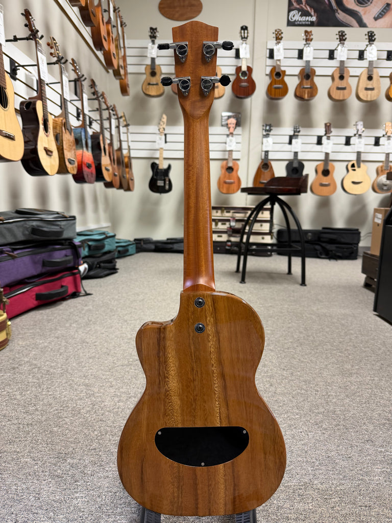 This amazing solid body electric uke features a solid chambered acacia body with a passive Pono pickup. A simple volume knob is all you need to unleash the beauty of this electric uke. Feedback is not an issue with the chambered body which is why this model is preferred by a lot of performing musicians. The macassar ebony fingerboard on the radiused fretboard provide an ultra smooth playing experience. Custom hardshell case included. Aloha !!