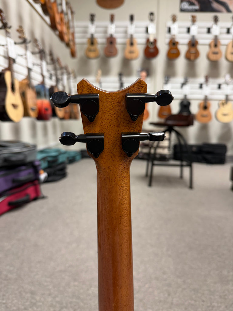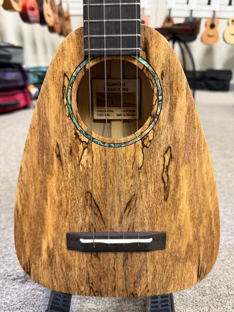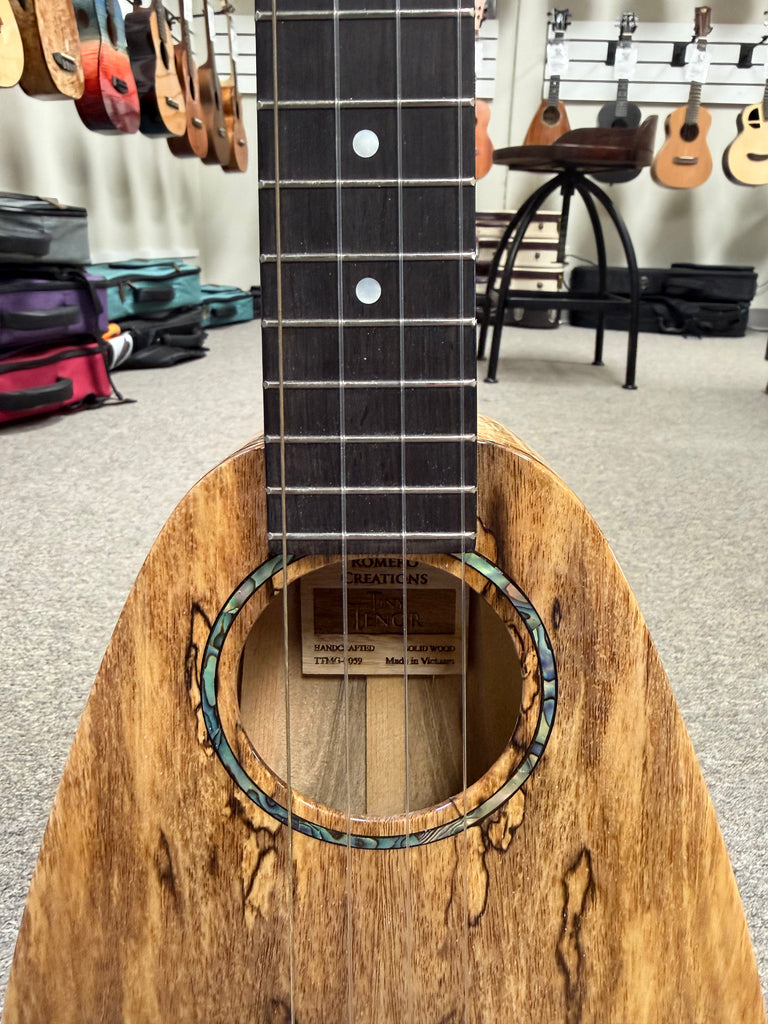 The Romero Creations Tiny Tenor is conceptualized by Grammy award-winning ukulele virtuoso Daniel Ho and master luthier Pepe Romero, the Tiny Tenor is a tenor scale ukulele built to the length of a concert ukulele, maximizing portability without compromising sound. It's really an amazing instrument in looks, tone and portability. This one is made out of premium solid spalted mango wood and it looks and sound amazing! Comes with a nice Romero Creations case.