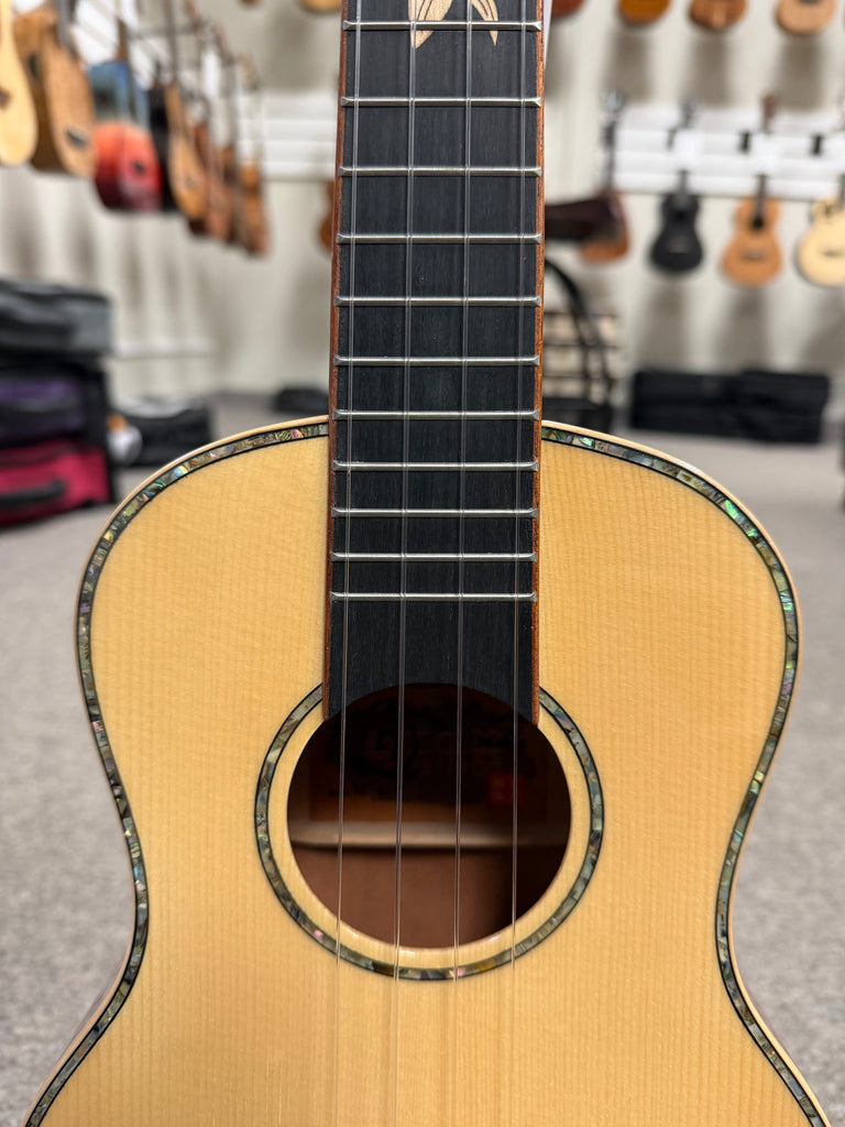 Gorgeous tenor ukulele here from Snail. This model features a solid spruce top with ebony back and sides. It has maple binding all around the body and abalone on the top and around the sound hole. The slotted headstock and maple hibiscus fretboard inlay add a nice touch of class. Plays and sounds as good as it looks. Aloha to that!!