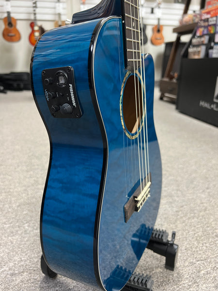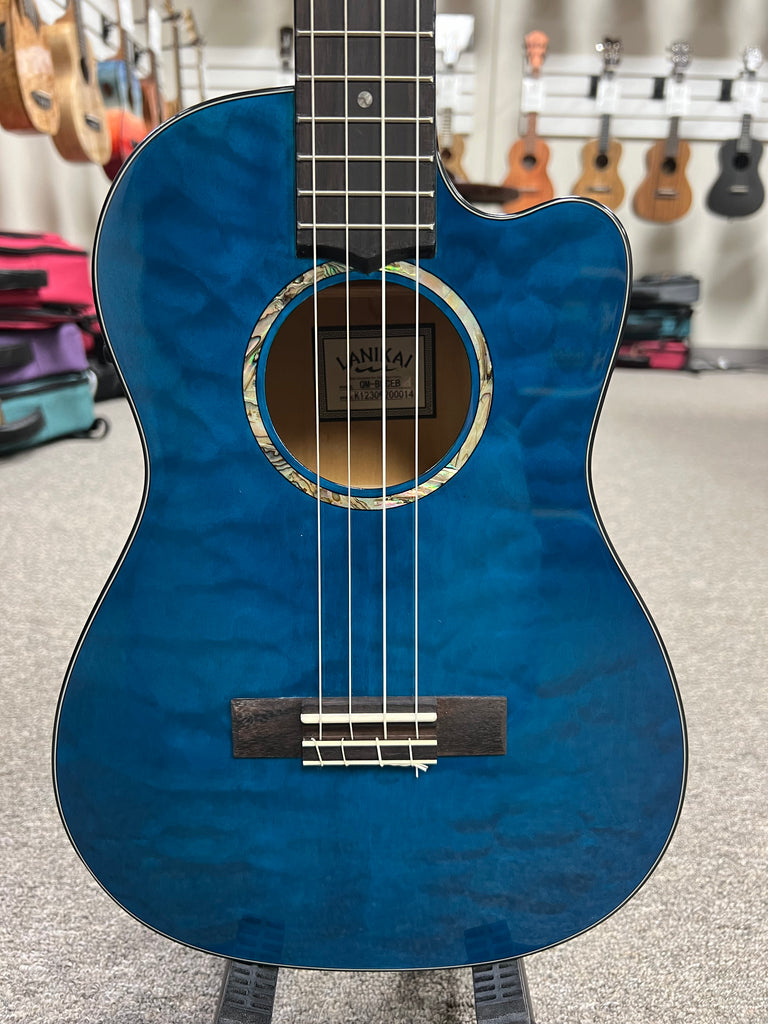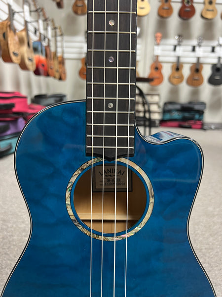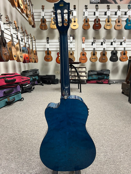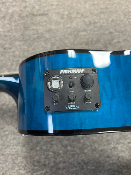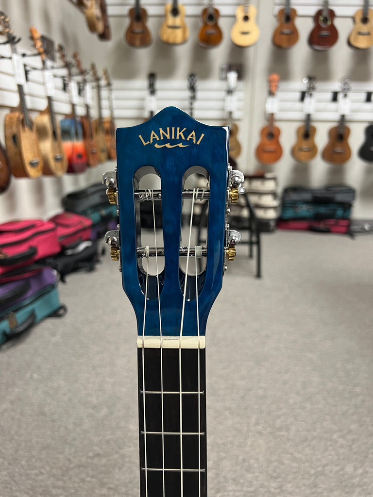 LANIKAI QM-BLCEB Quilted Maple Electric Baritone Ukulele w/Case - Transparent Blue - Aloha City Ukes