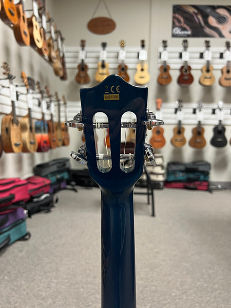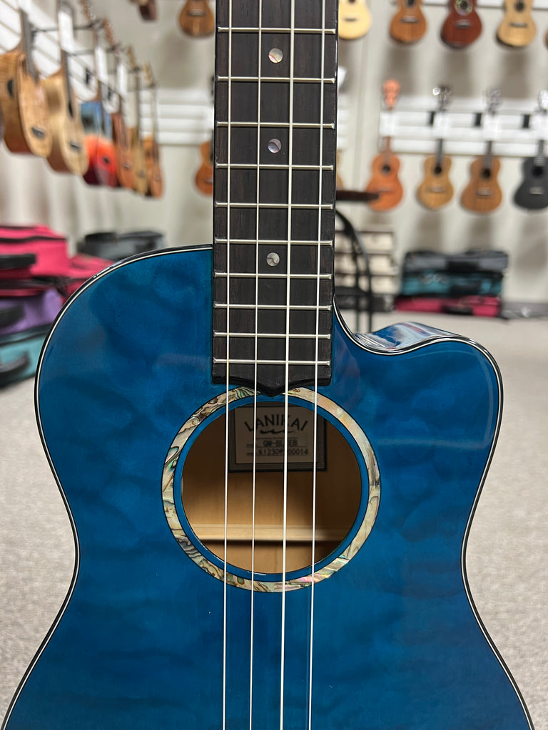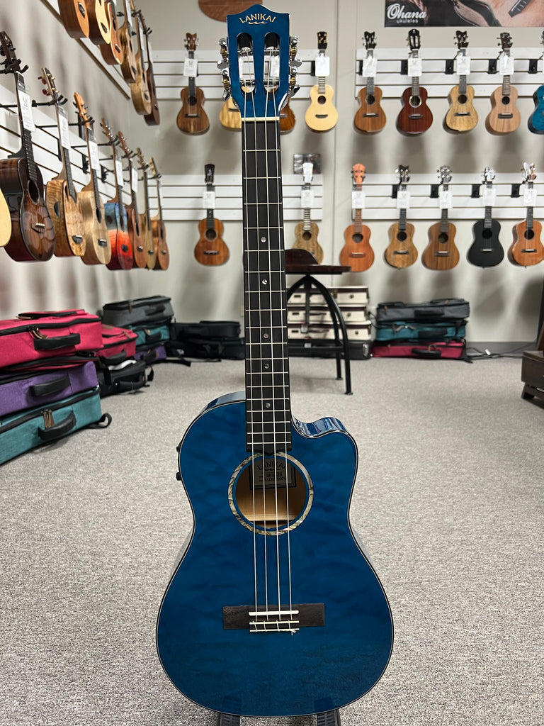 This is one AMAZING looking ukulele. The transparent blue finish over the quilted maple with all of the abalone is spectacular and the slotted headstock adds a nice touch of class as well. It plays great and comes with a Fishman EQ and built-in tuner so you're ready to plug in and always be in tune. Comes with a Lanikai Deluxe Case. Aloha !!