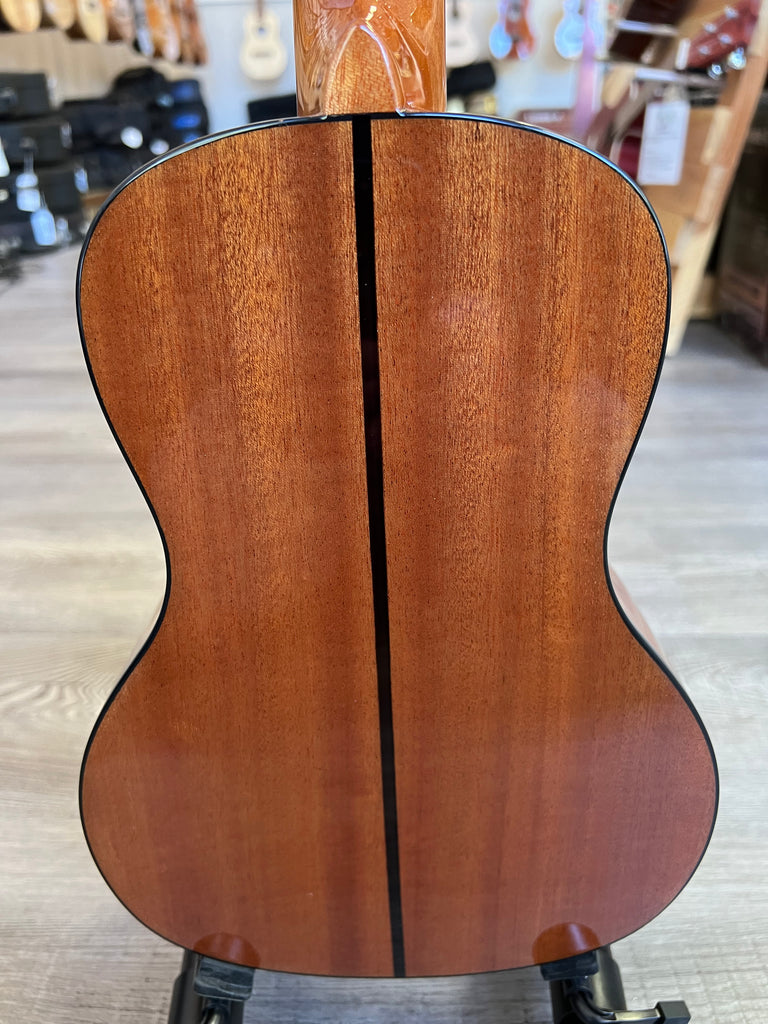 The ukulele's gloss finish enhances the natural wood grain, while black and white binding adds a touch of elegance. The mother-of-pearl and abalone rosette around the soundhole further elevates its visual appeal. The mahogany neck features an 18-fret walnut fingerboard with low action, ensuring smooth playability and comfort for players of all skill levels.