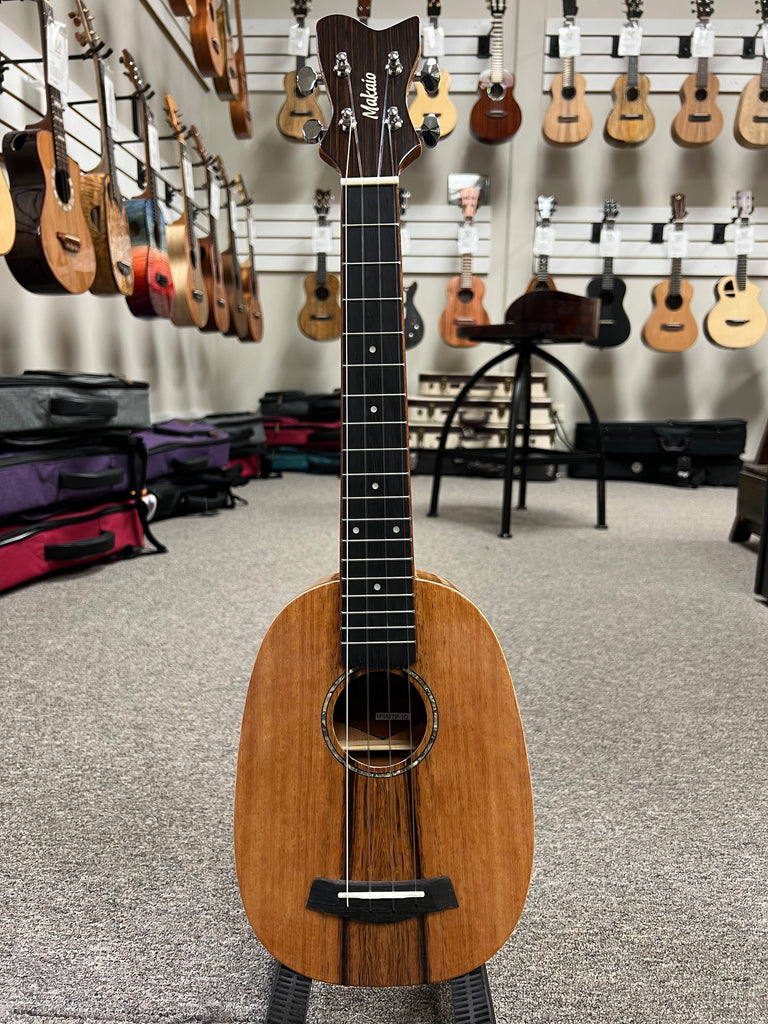 The Makaio MSMTP-10 is a concert-sized ukulele with a unique pineapple body shape and a long tenor neck, offering a distinctive aesthetic and enhanced playability. Crafted from spalted mango, this instrument showcases the wood's striking grain patterns, making each ukulele one-of-a-kind.