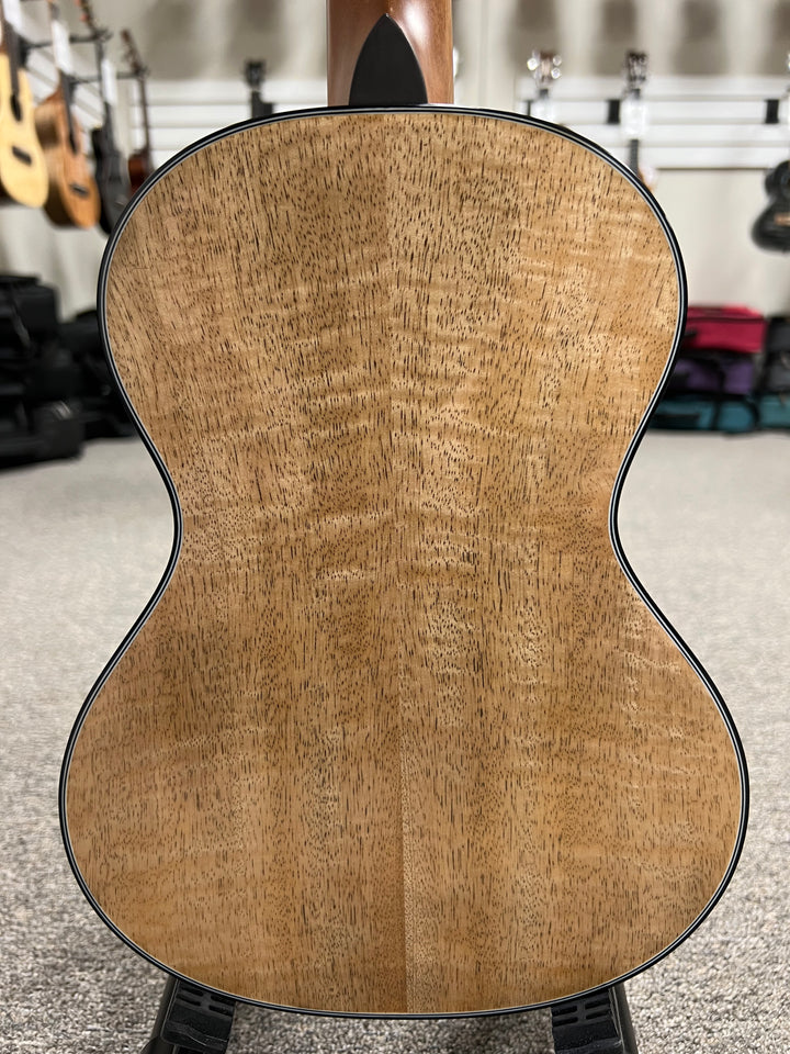 Crafted from all-solid curly mango wood, this ukulele boasts a distinctive appearance with its intricate blonde and caramel streaks. The gloss finish enhances the natural beauty of the wood, while black ABS binding and a rosewood rosette add elegant detailing. The mango neck and ebony fingerboard provide a smooth playing surface, ensuring comfort during extended sessions.
