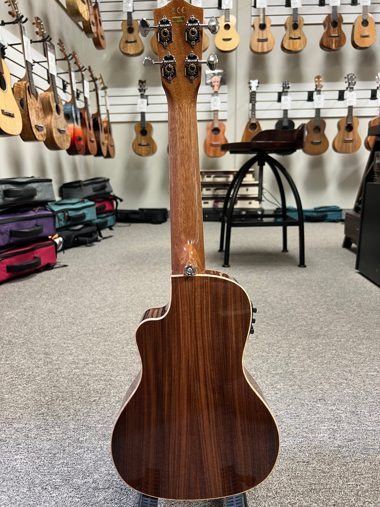 This concert sized uke is made from all solid morado wood and looks amazing. The flamed maple binding adds a nice classy touch and the abalone inlays make it pop even more. It also plays super smooth and has a great lively tone. It comes with the Fishman EQ and built-in tuner so you're ready for the stage or studio. Aloha !!