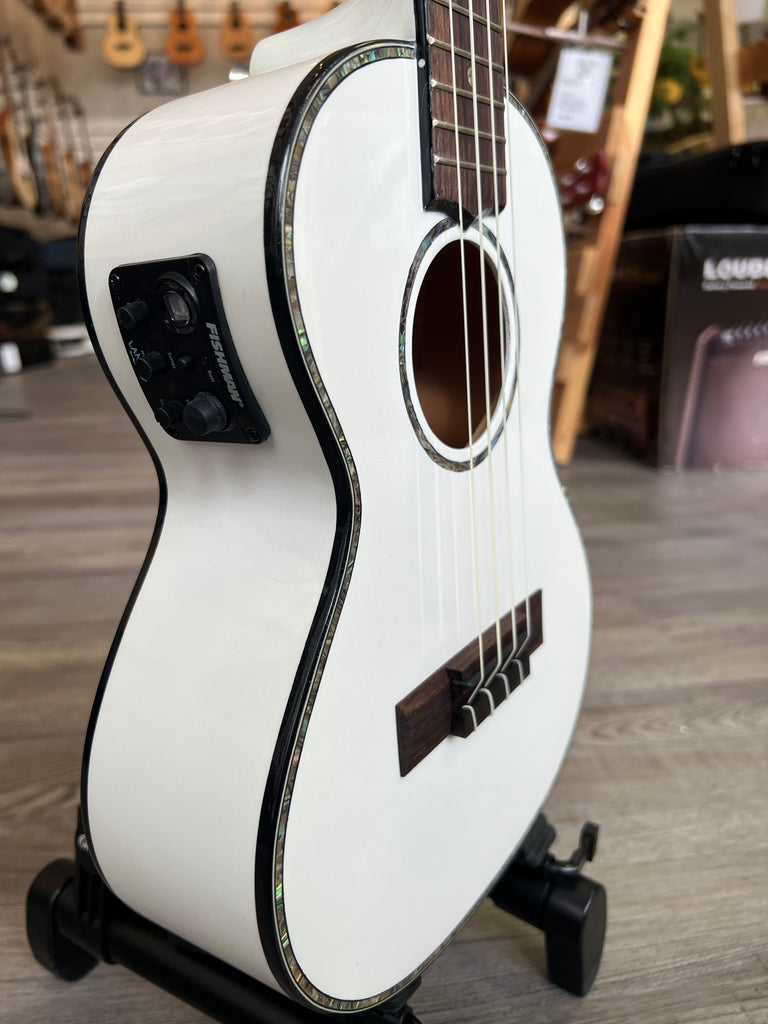 The Lanikia Julia Michaels Tenor Ukulele is one awesome sounding and looking ukulele. The white pearl finish looks super classy and the Fishman pickup system makes it stage ready.