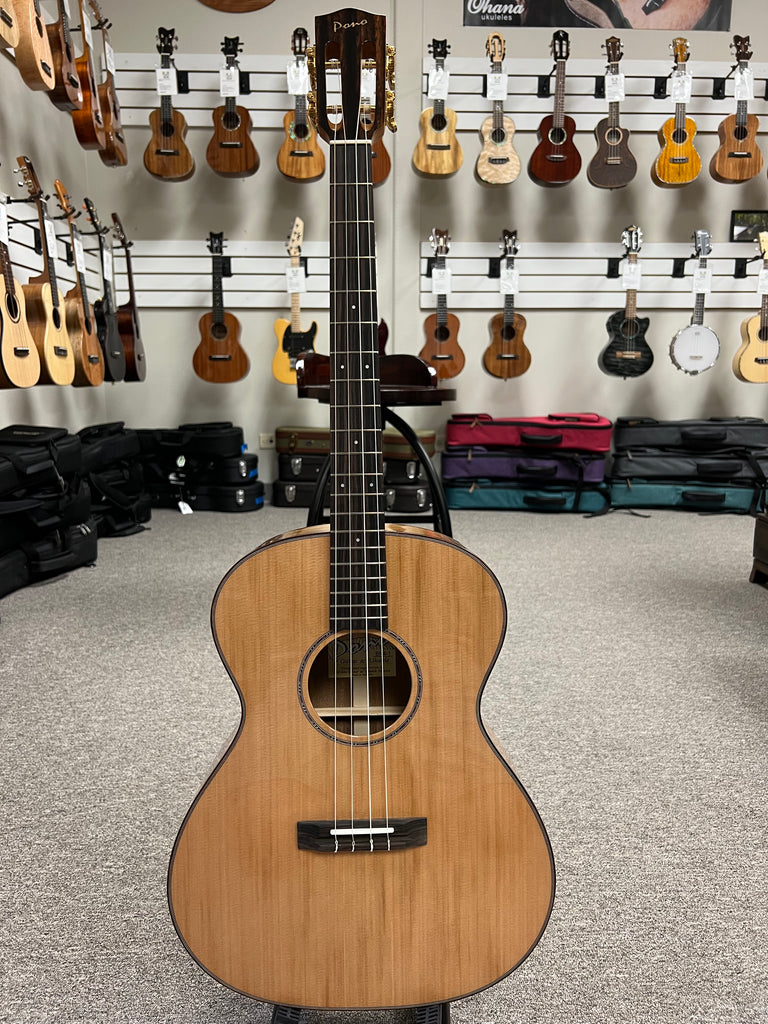 This big body baritone ukulele from Pono is really an amazing instrument. It's basically a tenor guitar that is set up with nylon strings and tuned D G B E. The large solid cedar top and acacia body provides a big, warm beautiful sound while the nylon strings are nice and easy on the fingers. Comes with a nice Pono padded case.