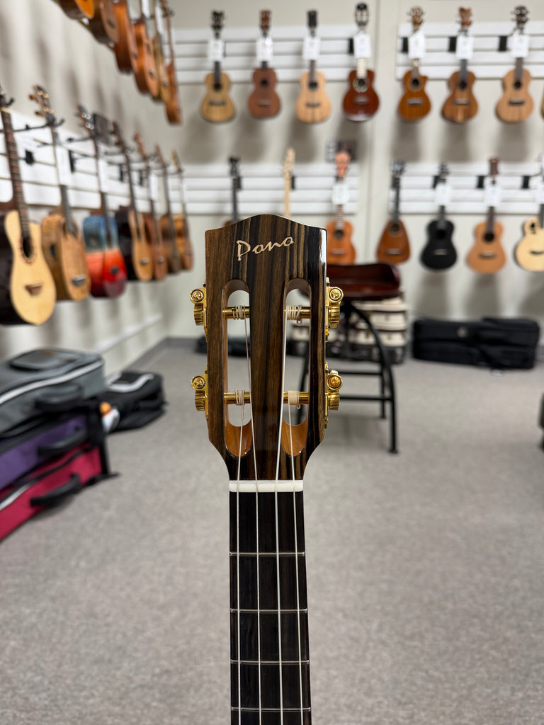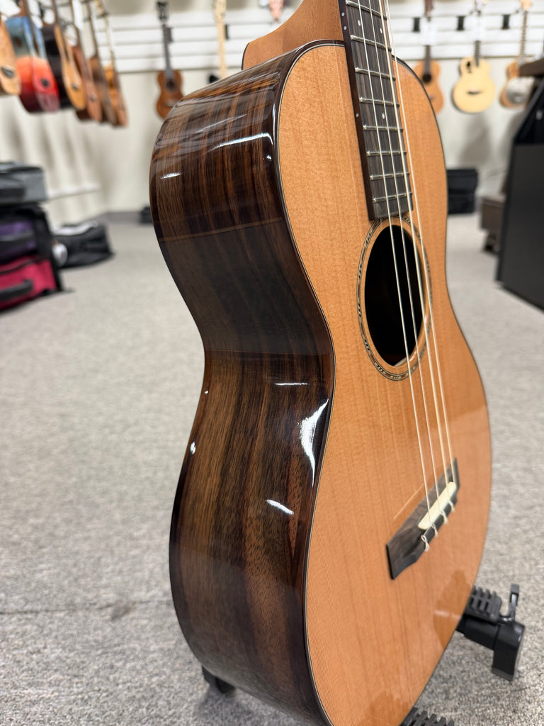 This big body baritone ukulele from Pono is really an amazing instrument. It features a solid cedar and rosewood body with rosewood binding. It's a combo that produces a big, warm tone. This is the nylon string model and is tuned like a regular baritone DGBE.