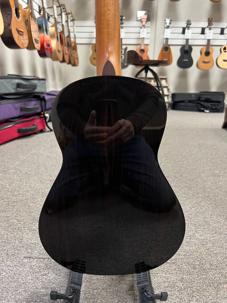 Gorgeous looking and sounding solid spruce/ebony baritone here from 'Oli Ukulele. An ebony bridge and fingerboard along with a radius fretboard make this uke a joy to play. It also has an ebony comfort contour armrest and a side sound port that projects the sound up at you while you play. It has a high gloss body with a satin finish on the neck for easy playability.