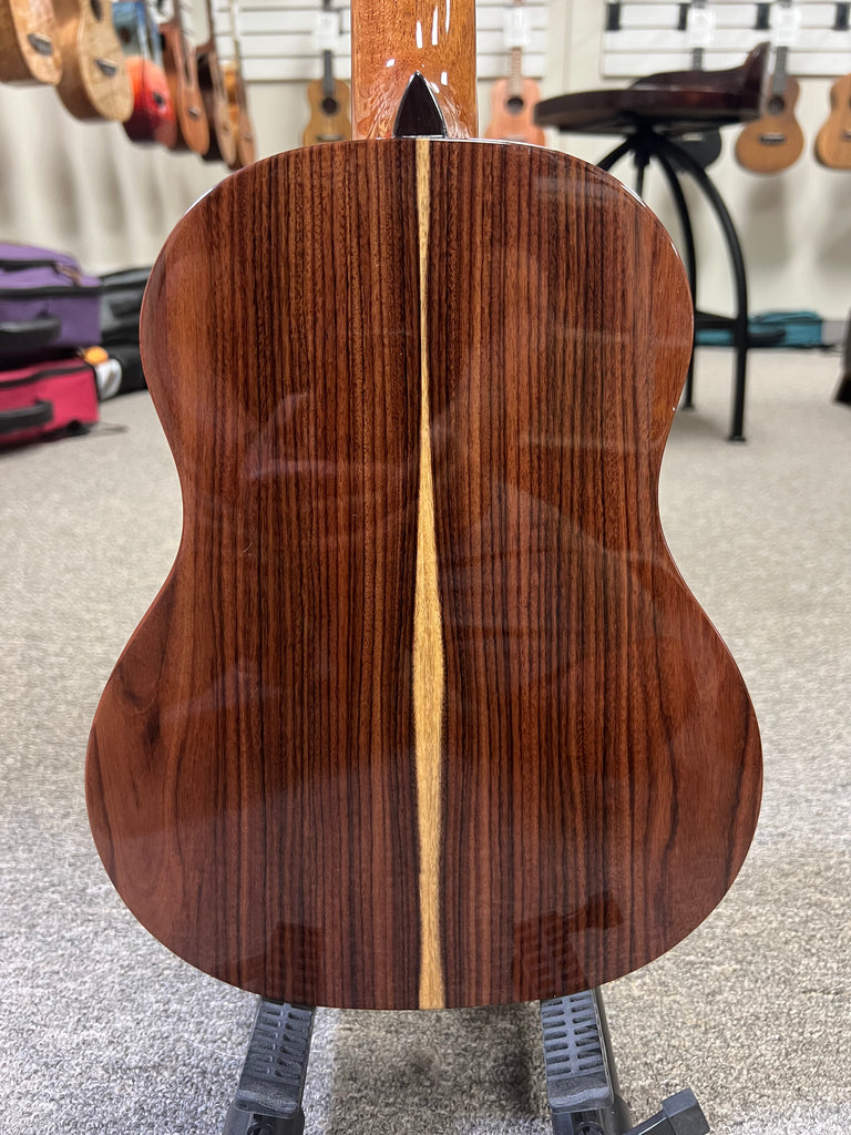This model features a solid spruce top with some gorgeous solid pau ferro back and sides. The abalone rosette and black tuners add a nice touch of class to a great sounding instrument. You won't be disappointed by this beauty. Comes with a Romero Creations case. Aloha !!