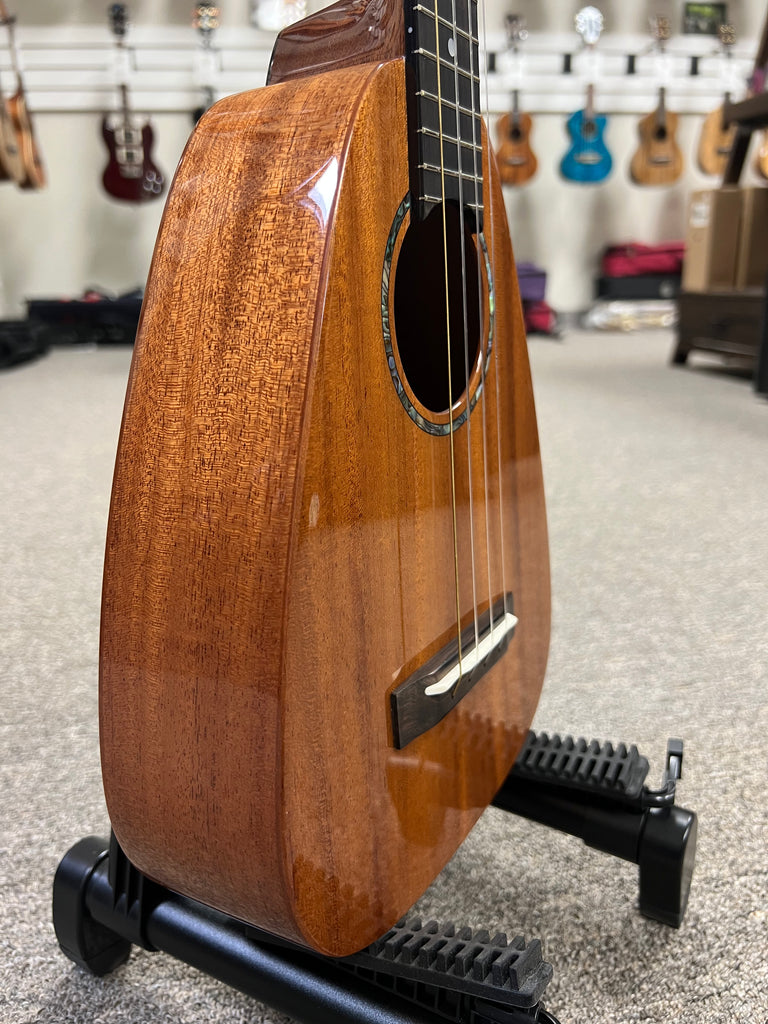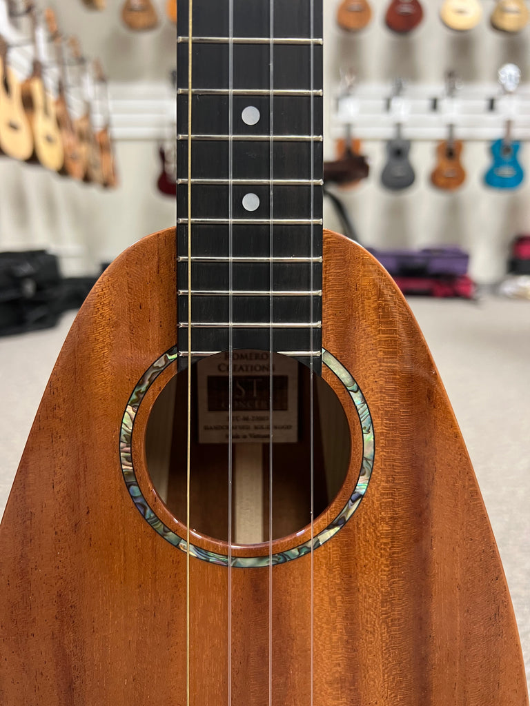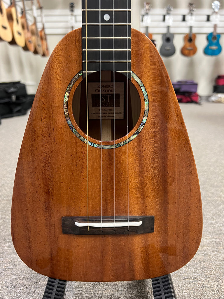 “STC” stands for Soprano, Tenor and Concert. The ST Concert combines the overall length of a soprano ukulele, the body of a tenor, and the scale of a concert ukulele. This classy looking uke will amaze everyone who sees, plays or hears it. It may be small, but that's the beauty of it. With the lowered bridge and short headstock it makes it ultra portable while the concert size scale and tenor depth body give it a full tone. The all solid mahogany looks ultra rich with the beautiful gloss finish and abalone inlays. Comes with a Romero Creations case. Aloha !!