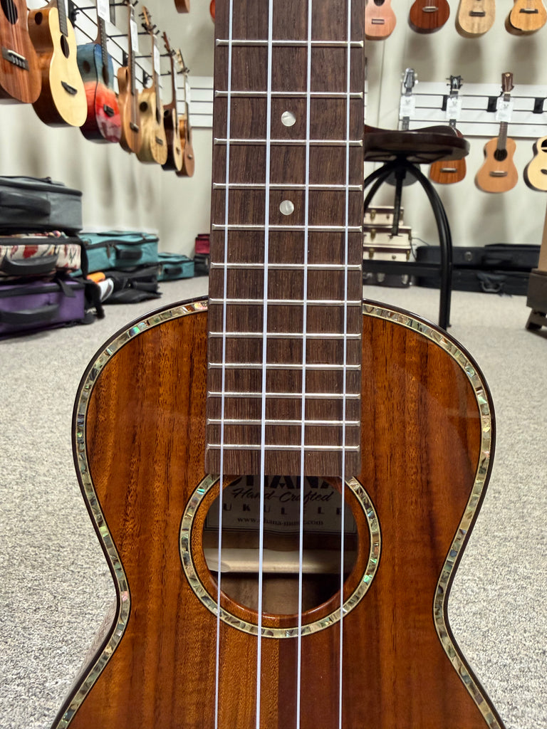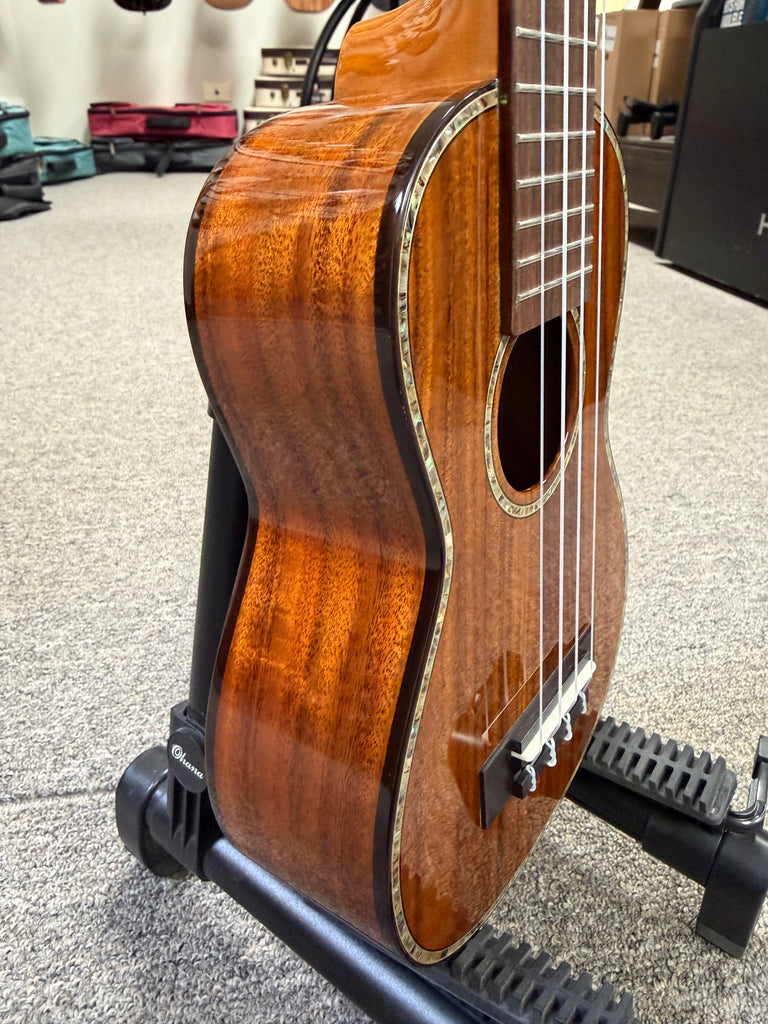 The Ohana SK-270M is one classy looking super soprano. It features an all solid acacia body with abalone all around the top and the headstock. The super soprano means it's got a soprano body with concert scale making it easier to play than the standard soprano.