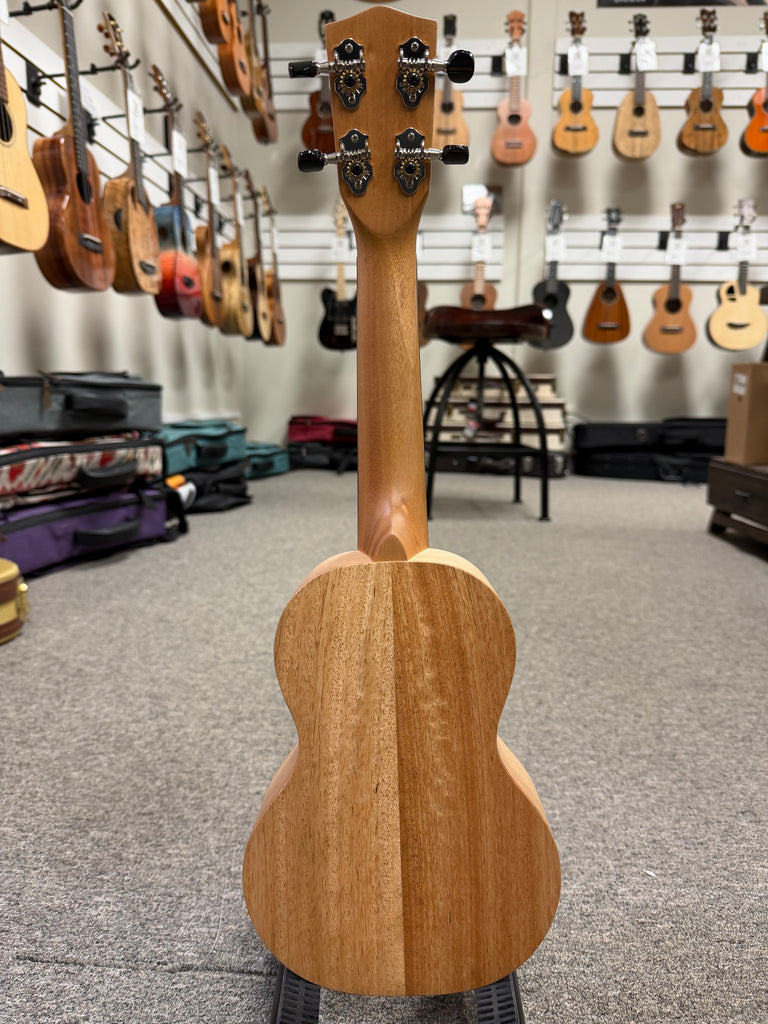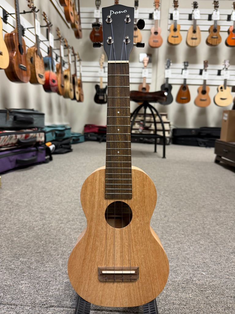 Great little soprano from Pono Ukuleles. This one features an all solid mango body to go along with the merbau bridge and fingerboard. The tone is very warm and classic Hawaiian ukulele sounding. The action is also great making it easy to play for hours. Aloha to that !!