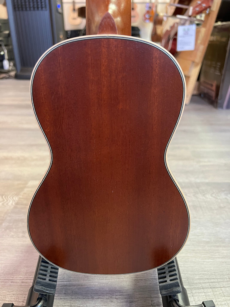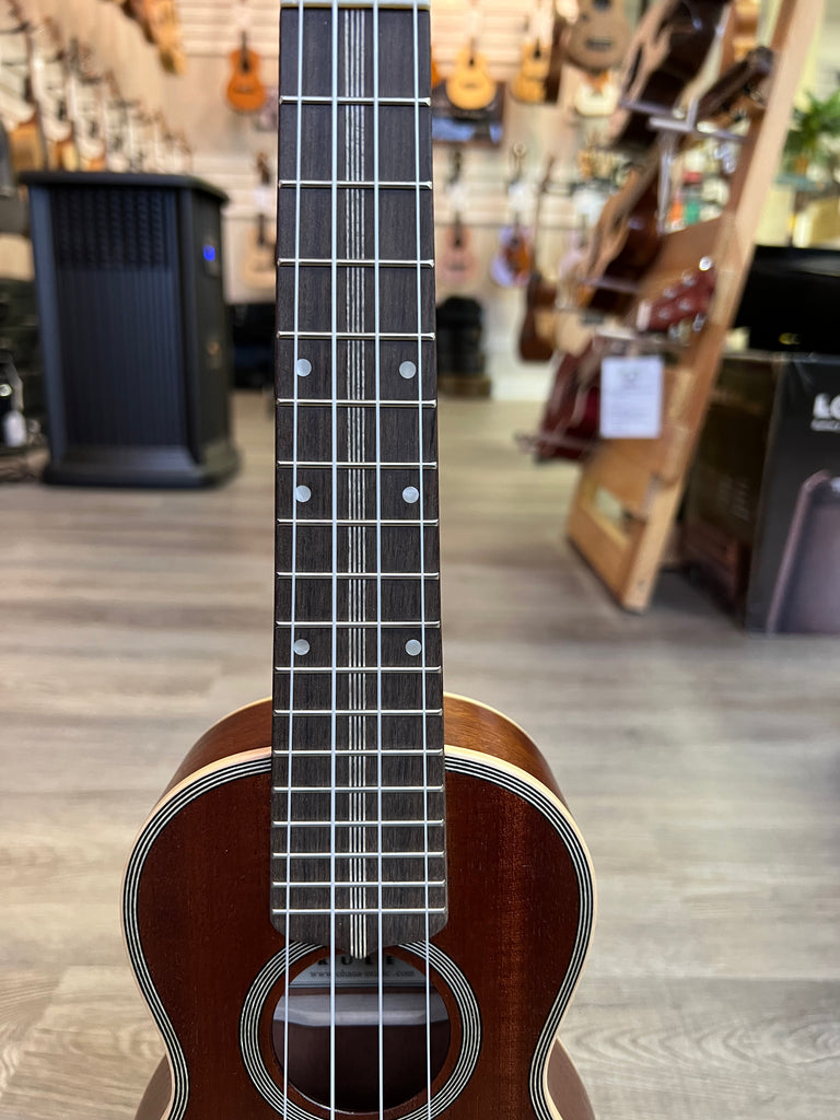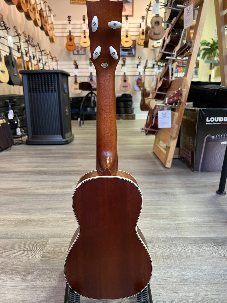 This Ohana soprano features a super light weight solid mahogany body that produces a very sweet lively tone. Based on the old Martin 3M ukes it has a nice vintage vibe to it. Maple binding adds a nice touch of class to a great little uke.