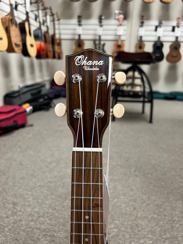 This Ohana soprano is one great sounding uke! The construction consists of a beautiful solid cedar top with willow wood back and sides. It projects very well with a great lively tone to it. The rope style rosette and mahogany binding are great looking and the high gloss finish really makes this uke shine! Aloha !!