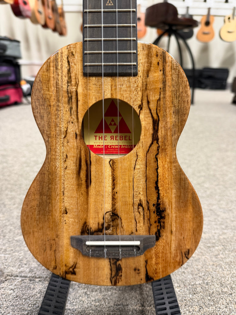 This great Rebel Ukulele features a solid mango body to go along with the ebony bridge and fingerboard. This uke produces a very lively tone that projects very well. The slightly slimmer body makes it super comfortable to play. Aloha!