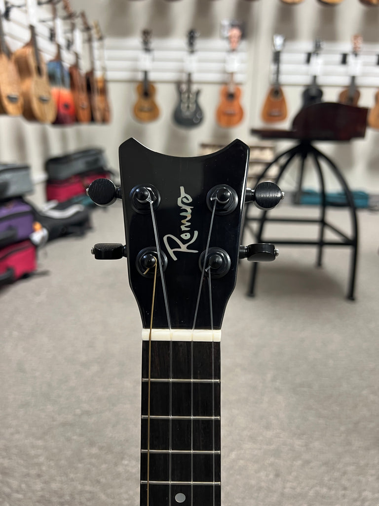This Romero Creations soprano ukulele is not your average soprano sized uke! Its larger body and all solid wood construction produce an amazingly full tone. Like all Romero Creations ukes it's also a joy to play as the action is perfect all the way up the neck. You'll get a nice big sound from this solid wood uke. All Romero's come with a Low G set up and a nice Romero Creations case. Aloha !