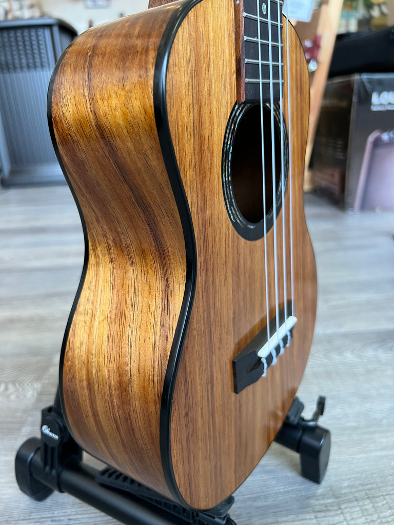 Very classy looking Kumu tenor ukulele. This beauty features a Hawaiian koa body with a very cool abalone inlay around the soundhole and headstock. Black binding and black tuning machine buttons add to the classiness of this uke! Aloha !!