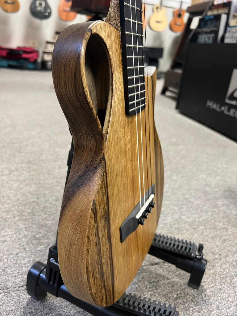 Crafted with exacting care in Petaluma, California, this tenor‐sized ukulele presents a bold re‐imagining of form and tone. Built entirely from solid korina (also known as black limba) for the top, back, sides and neck, the instrument strikes a rare balance of lightness and powerful resonance.