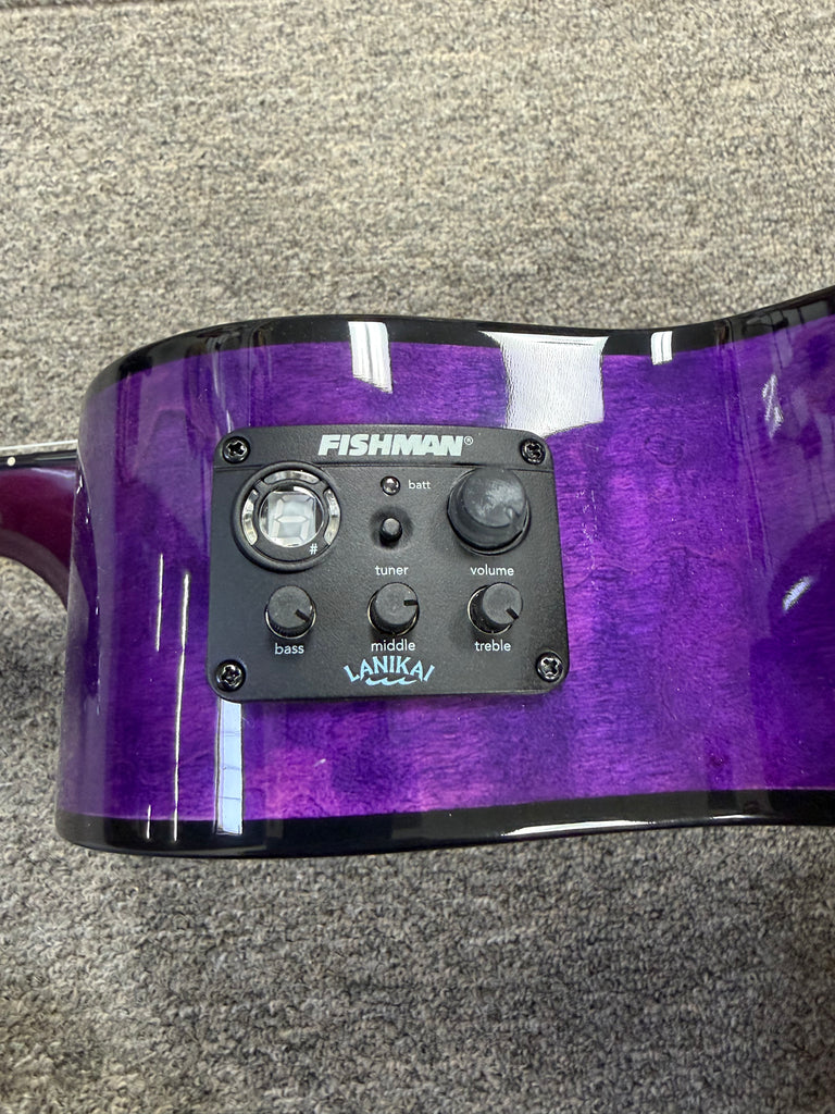 This is one AMAZING looking ukulele. The trans purple finish over the quilted maple with all of the abalone is spectacular and the slotted headstock adds a nice touch of class as well. It plays great and comes with a Fishman EQ and built-in tuner so you're ready to plug in and always be in tune. Comes with a Lanikai Deluxe Case. Aloha !!