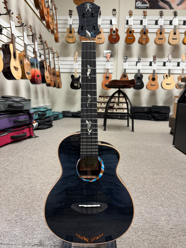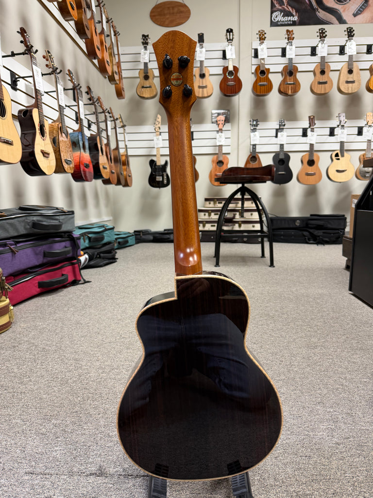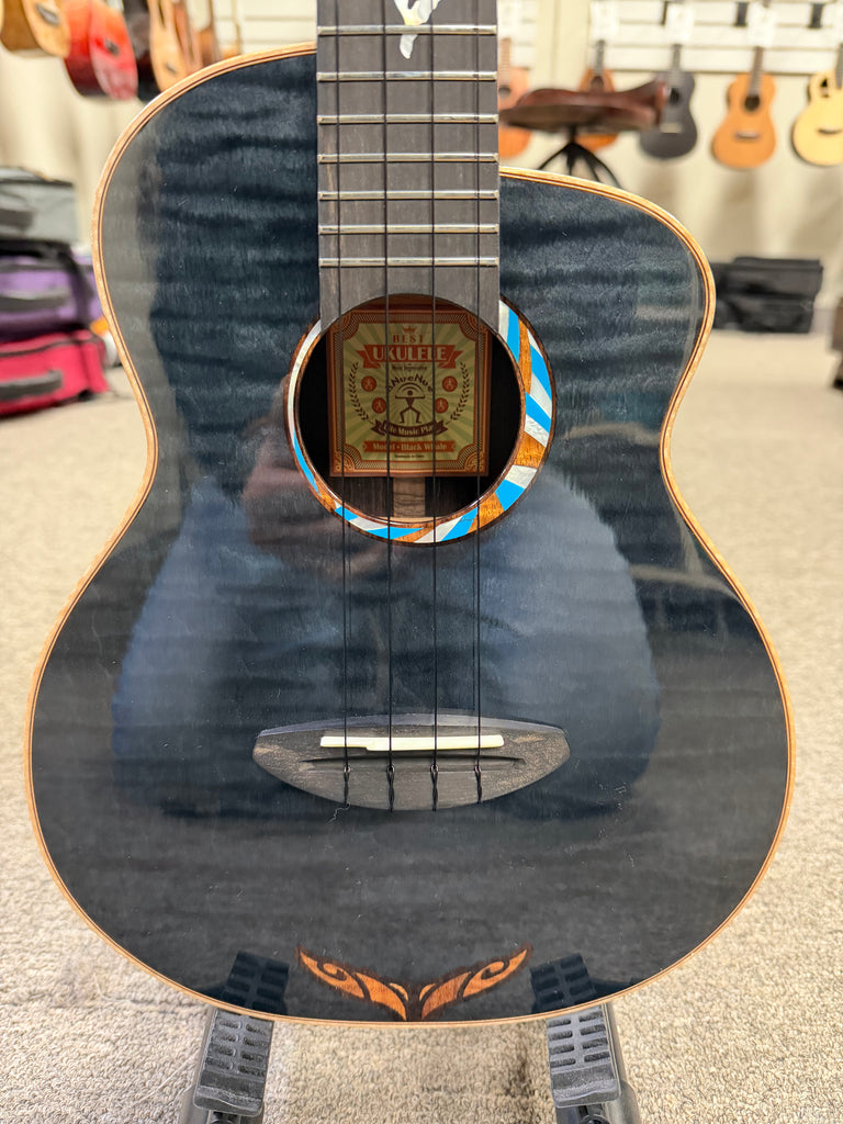The aNueNue Black Whale Tenor Ukulele is a truly exceptional instrument, combining artistic aesthetics and refined craftsmanship with outstanding tonal character. Its top is built as a “double top” — a delicate sandwich of stained curly black maple layered over Western red cedar — offering the crisp, articulate clarity and sparkle of cedar alongside the warm, nuanced depth of maple. The back and sides are crafted from Indian rosewood, adding resonant warmth and richness to the sound.