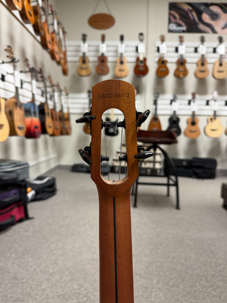 The Flight Mustang electric tenor ukulele is a thing of beauty. It features a solid acacia wood body with an ultra modern looking headstock design. It also has a scalloped cutaway for hours of easy playing. This is the electric model that has a built in pickup with the volume and tone controls discretely hidden inside the sound hole. Aloha to that!!