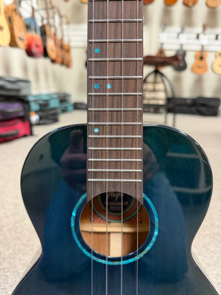 Flight is pleased to introduce a new version of one of its favorite Princess models, the Flight Iris Tinta Tenor. The Iris Tinta is an all-solid mahogany ukulele with a glossy finish that brings a cool, refined, contemporary feel to the Iris lineup. The Iris Tinta features the same beloved Iris shape and feel with the rich tone and beautiful natural grain of mahogany. You will love this transparent blue version of the Iris Tinta!