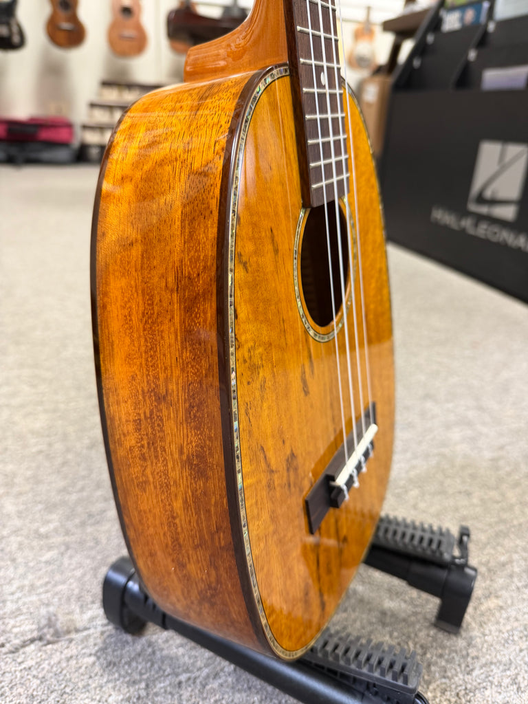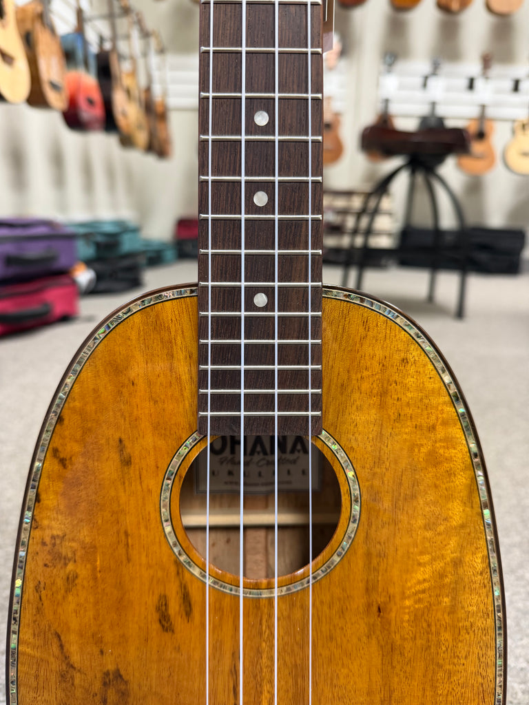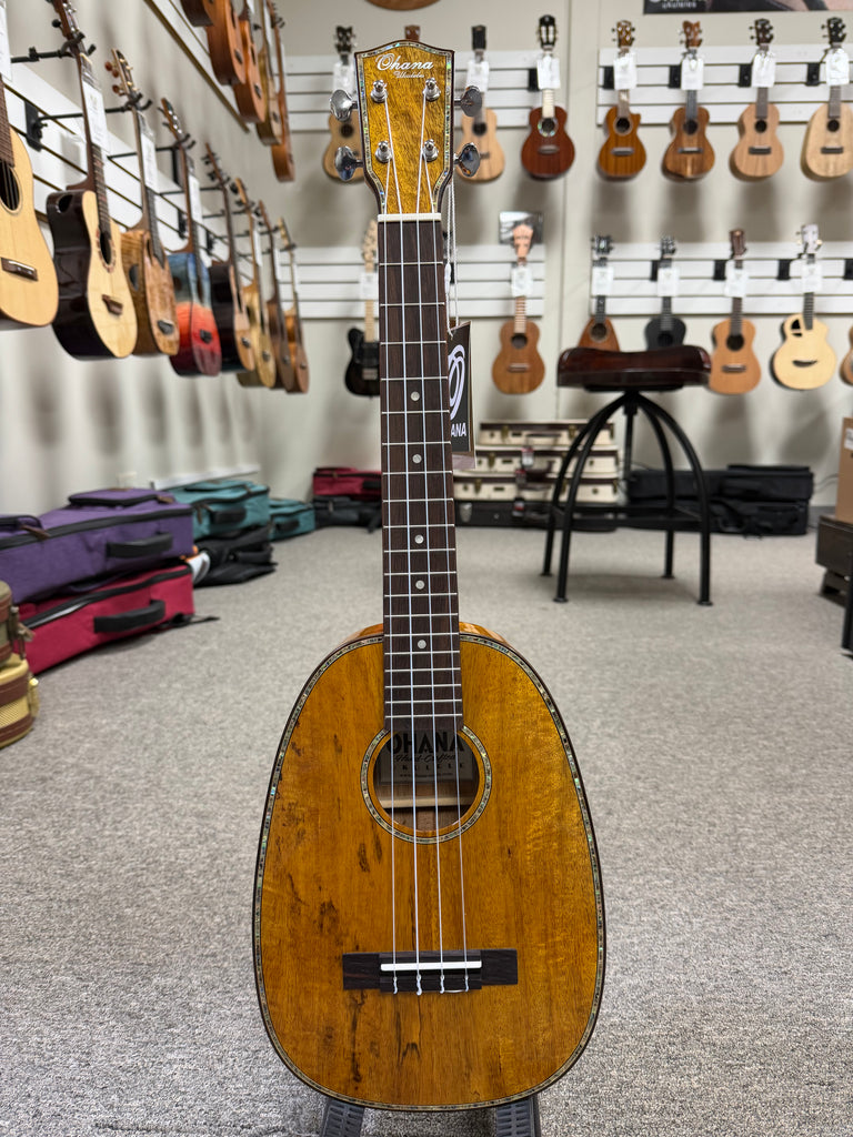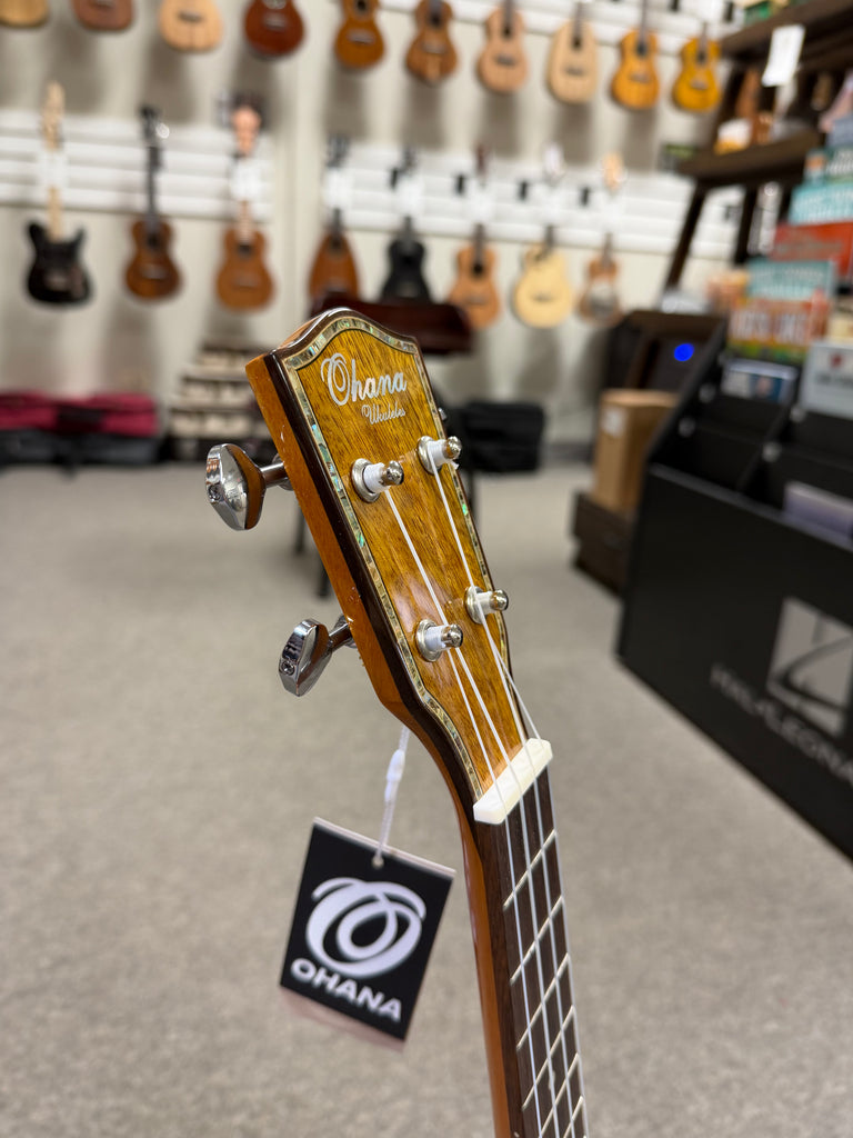 This gorgeous Ohana tenor pineapple uke is new to the Ohana lineup. The all solid mango wood body just gleams under the beautiful gloss finish. The abalone on the body and headstock really sets it apart and provides a very high-end look as well. It's also super smooth to play with great projection.