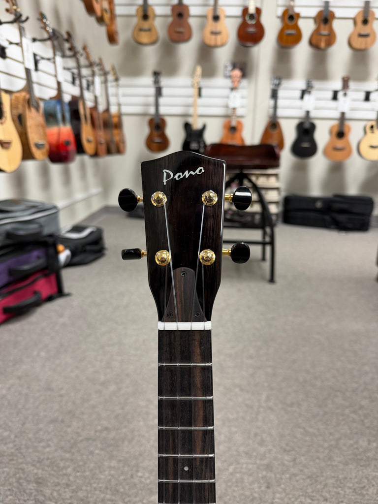 This amazing solid body electric uke features a solid chambered mango body with a passive Pono pickup. A simple volume knob is all you need to unleash the beauty of this electric uke. Feedback is not an issue with the chambered body which is why this model is preferred by a lot of performing musicians. The macassar ebony fingerboard on the radiused fretboard provide an ultra smooth playing experience. Aloha !!