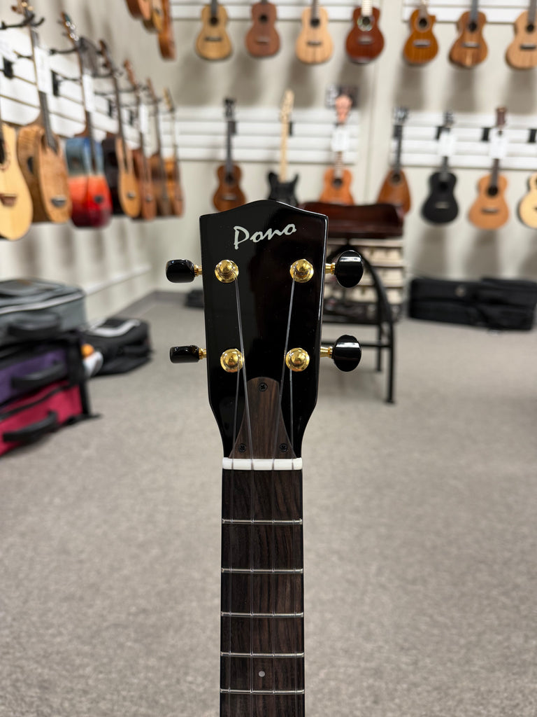 This amazing solid body electric uke features a solid chambered mango body with a passive Pono pickup. A simple volume knob is all you need to unleash the beauty of this electric uke. Feedback is not an issue with the chambered body which is why this model is preferred by a lot of performing musicians. The macassar ebony fingerboard on the radiused fretboard provide an ultra smooth playing experience. Aloha !!