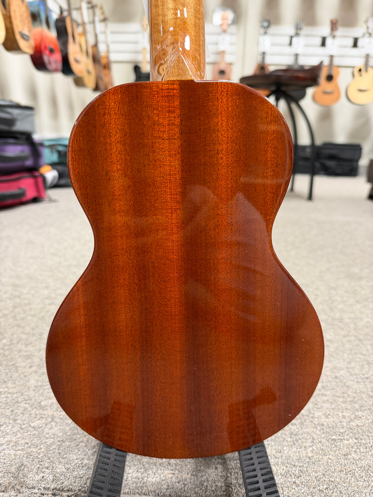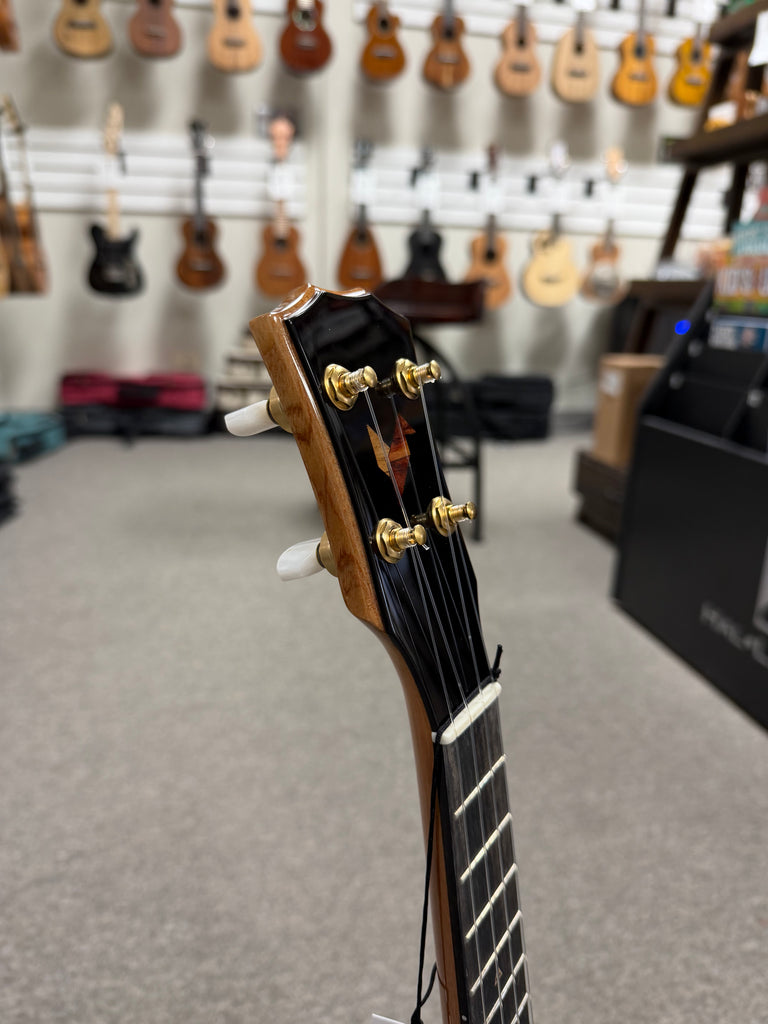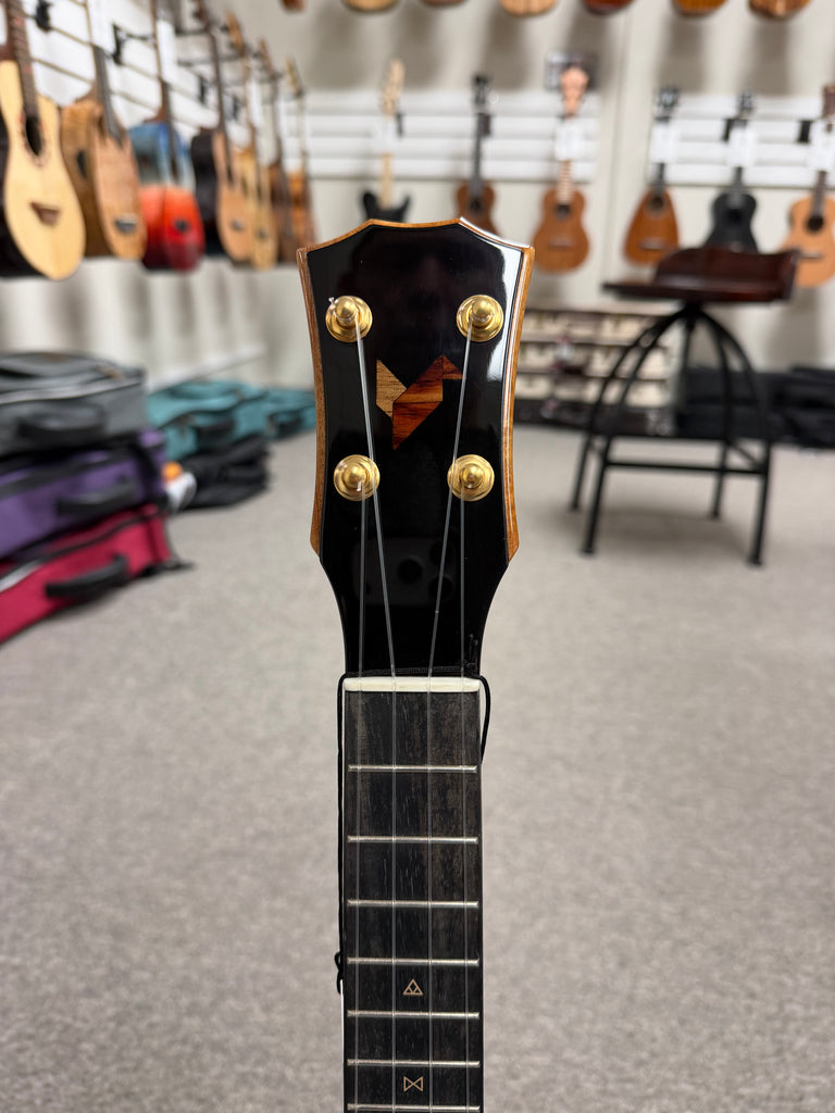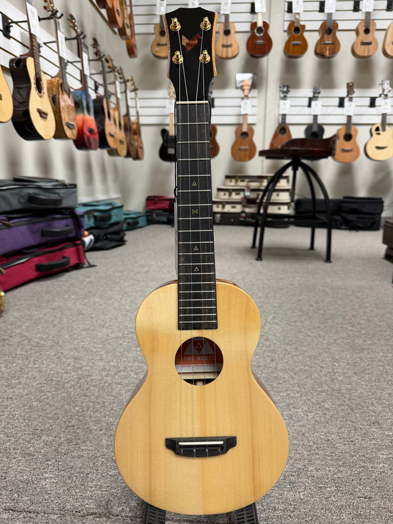 This great Rebel Ukulele features a solid spruce top to go with the solid mahogany back and sides. It also features an ebony bridge and fingerboard with cool triangle inlays and a side sound port. This uke produces a very warm and lively tone that projects very well. Aloha!