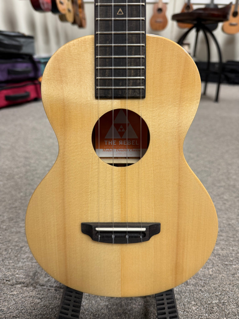 Rebel Double Cheese Solid Spruce/Mahogany Concert Ukulele w/Case - Side Sound Port