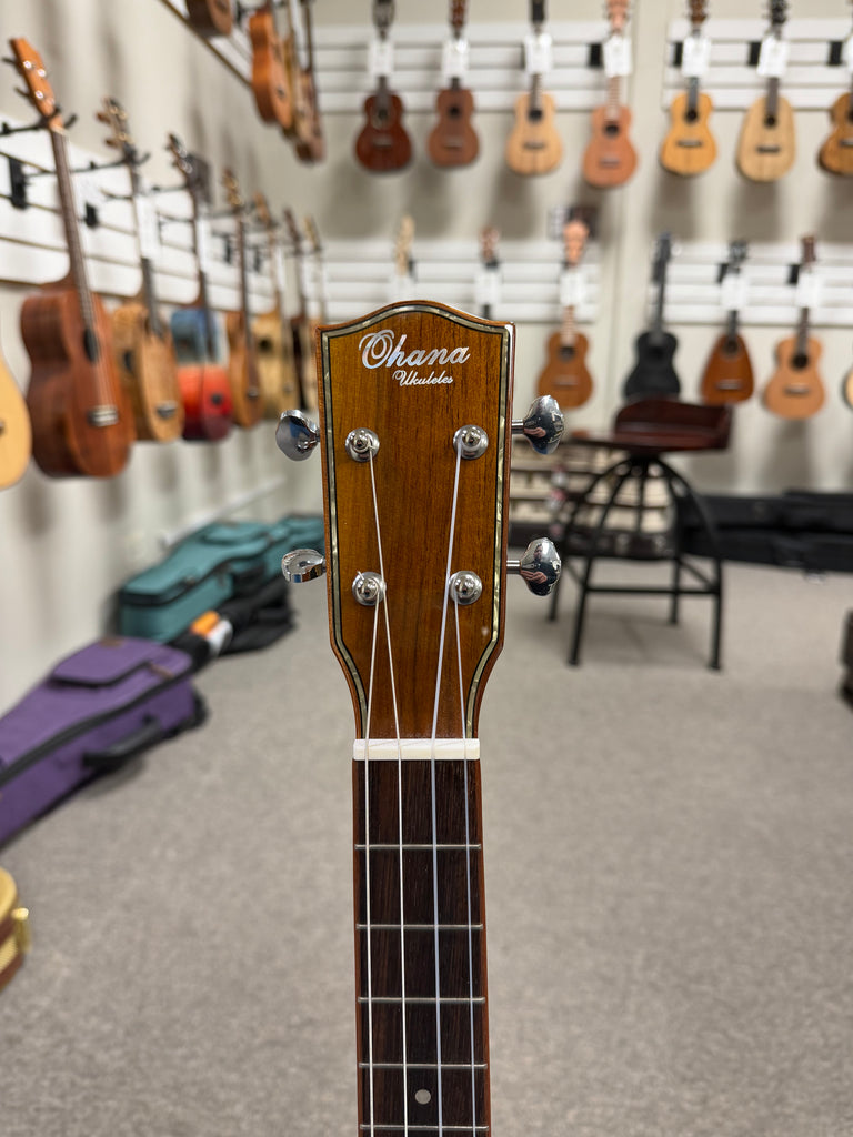 This Ohana baritone is one great-sounding uke! The all solid wood construction consists of a beautiful cedar top with rosewood back and sides. It's rich in sustain with a great mid-range. The abalone soundhole rosette is super classy looking and the super high gloss finish really makes this uke shine! Baritones are tuned D G B E. Aloha !!