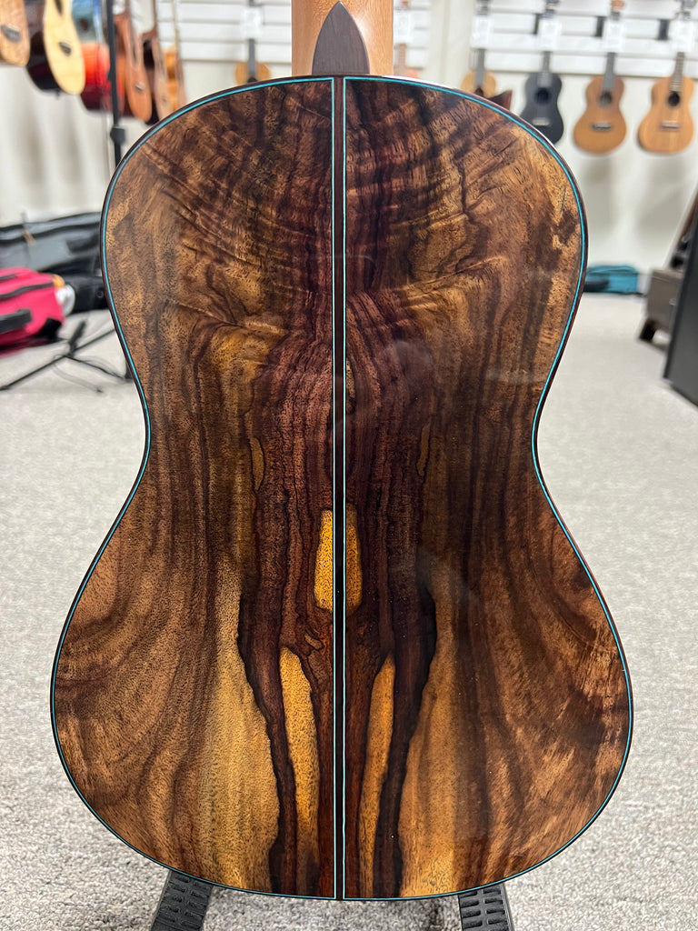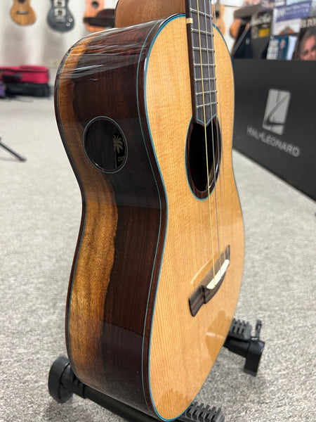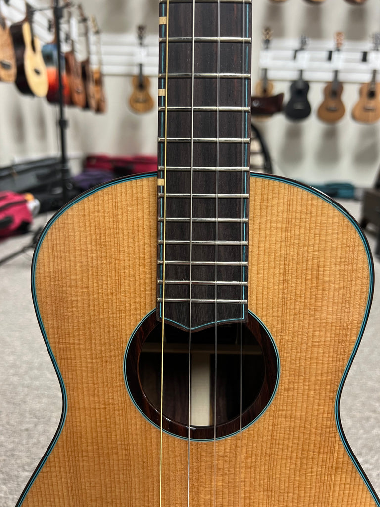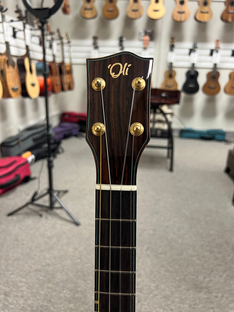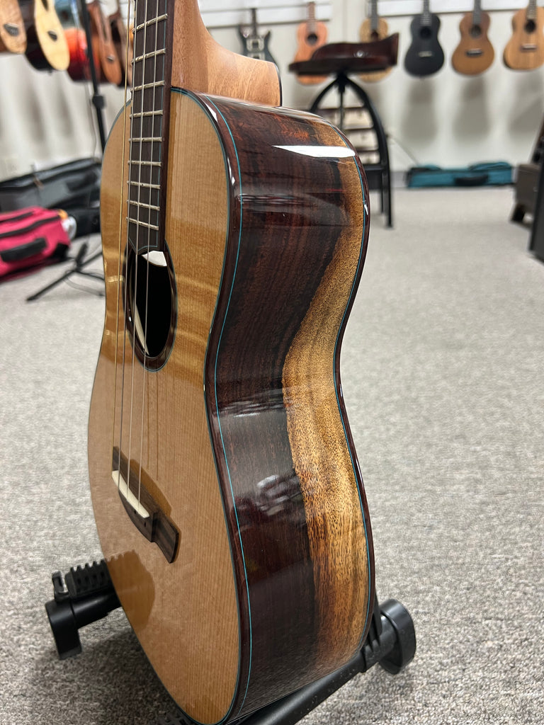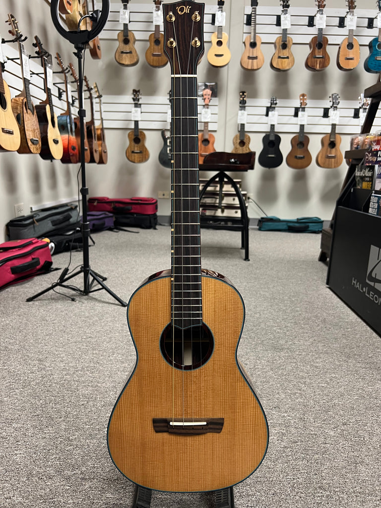 This is a new limited edition X braced series baritone from 'Oli ukulele with a Canadian western red cedar top and a rare black and white rosewood for the rosewood sides and back. Each one of these is a one of a kind beauty! This one sounds as great as it looks.