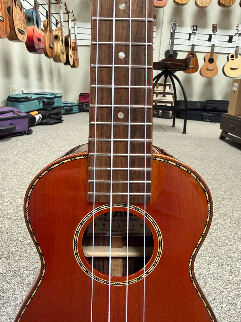 This Ohana soprano is one great sounding uke! The all solid wood construction consists of a beautiful cedar top with rosewood back and sides. It projects very well with a great lively tone to it. Aloha !!