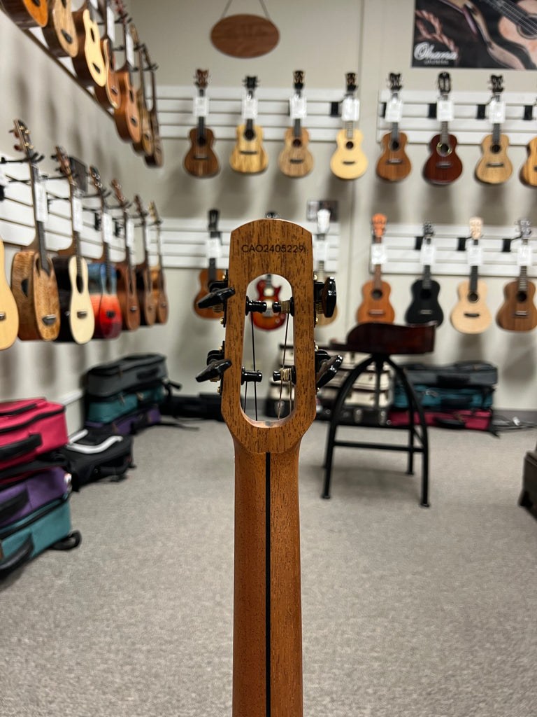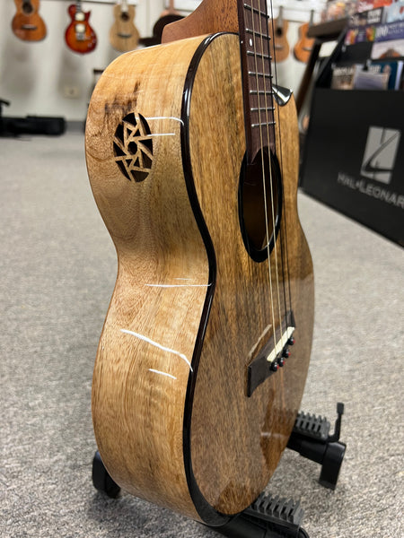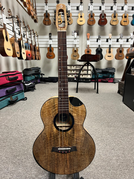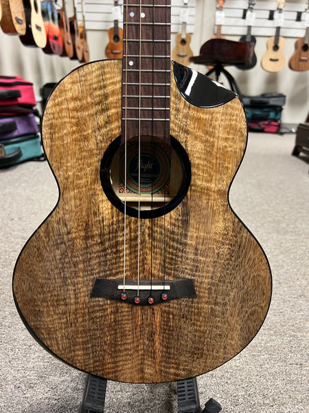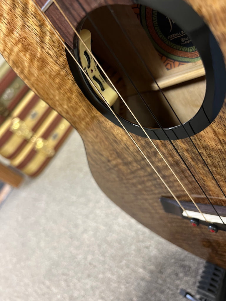 The Flight Fireball mango electric baritone ukulele is a thing of beauty. It features a solid mango wood body with an ultra modern looking headstock design. It also has a comfort contour armrest and scalloped cutaway for hours of easy playing. It also has a built in pickup with the volume and tone controls discretely hidden inside the sound hole. Aloha to that!!