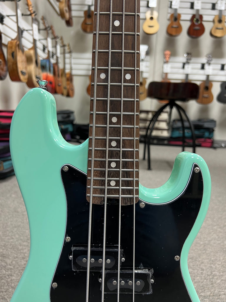 Drop the bass with style and value – meet the Flight Mini Bass Lite SFG! This fantastic instrument features a solid poplar body and nickel strings, offering a compact 584mm/23” scale that is perfect for bass players on the go. Whether you’re jamming at home or hitting the stage, the Mini Bass Lite delivers a comfortable playing experience with its sleek maple neck and smooth laurel fretboard. Dressed in a classic pastel green finish, it boasts a modern aesthetic that stands out on the stage. Stable intonation and reliable performance is achieved with a hardtail fixed bridge and chrome hardware. With its quality build and an attractive price, the Flight Mini Bass Lite is the go-to bass for every groove.