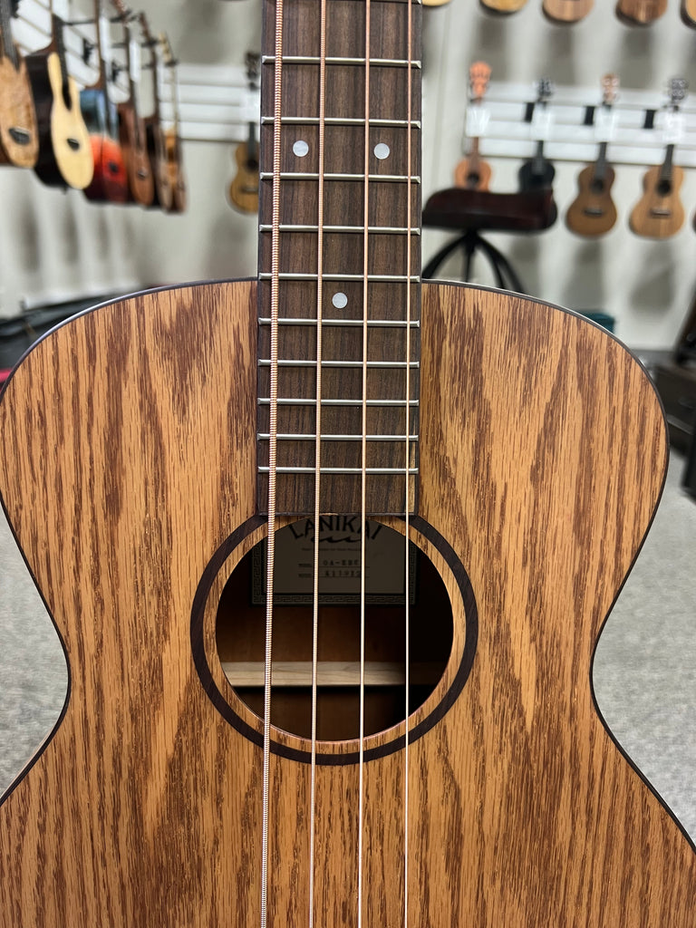 Great for stage or rehearsal, this Lanikai Oak Bass ukulele utilizes many features such as a truss rod for easy action adjustments, Fishman Classica II pickup with EQ and tuner, a comfortable neck profile, black open back tuners, NuBone XB nut and saddle, D’Addario strings, satin finish, and a Limited Lifetime Warranty.