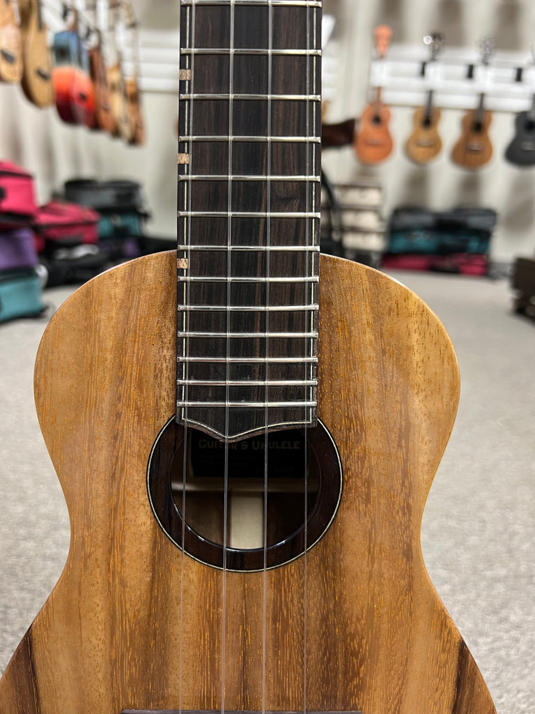 Gorgeous looking and sounding solid Acacia concert here from 'Oli Ukulele. An ebony bridge and fingerboard along with a radius fretboard make this uke a joy to play. The side sound port helps project the sound up at you while you play. This model has a smooth high gloss finish on the body and a satin finish on the neck. 2024 Model.