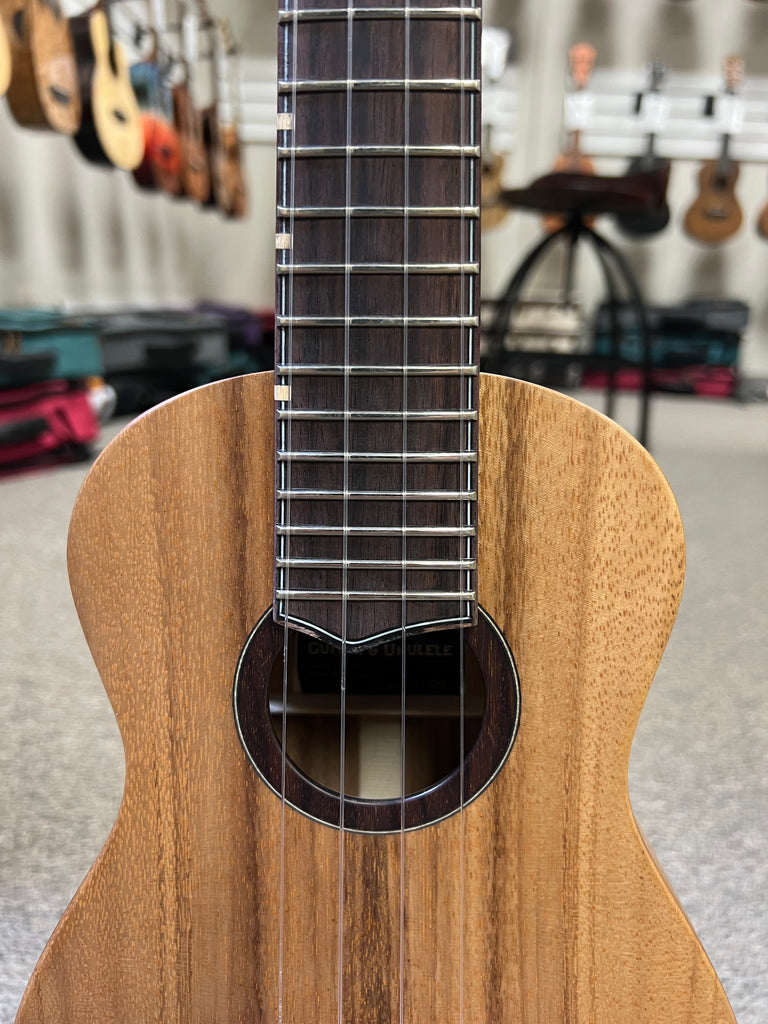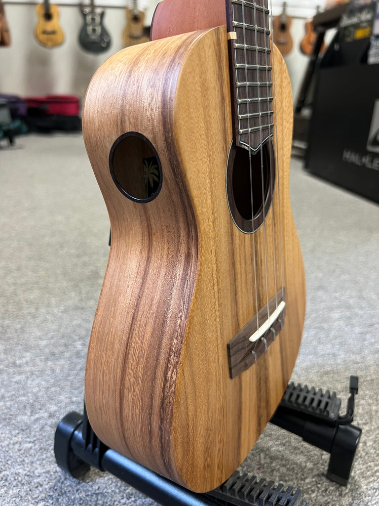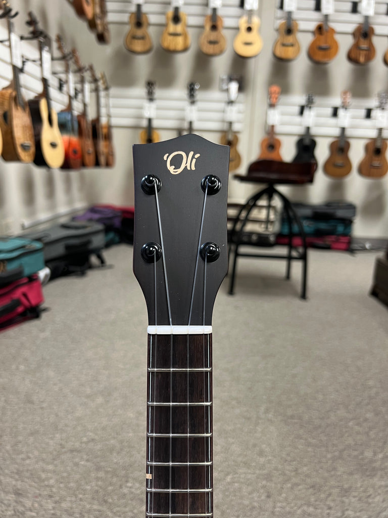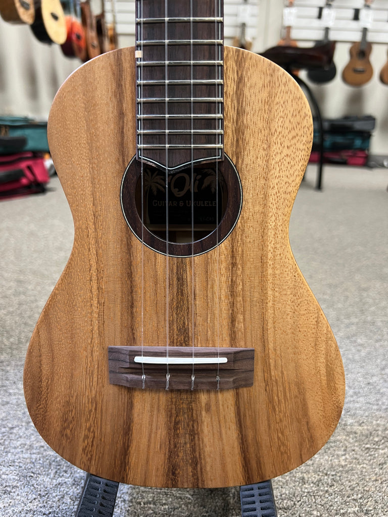 Gorgeous looking and sounding solid Acacia concert here from 'Oli Ukulele. An ebony bridge and fingerboard along with a radius fretboard make this uke a joy to play. The side sound port helps project the sound up at you while you play. This model has a smooth satin finish on the body and a satin finish on the neck. 2025 Model.