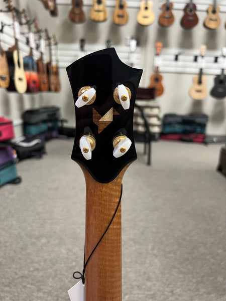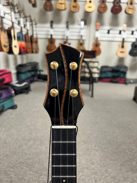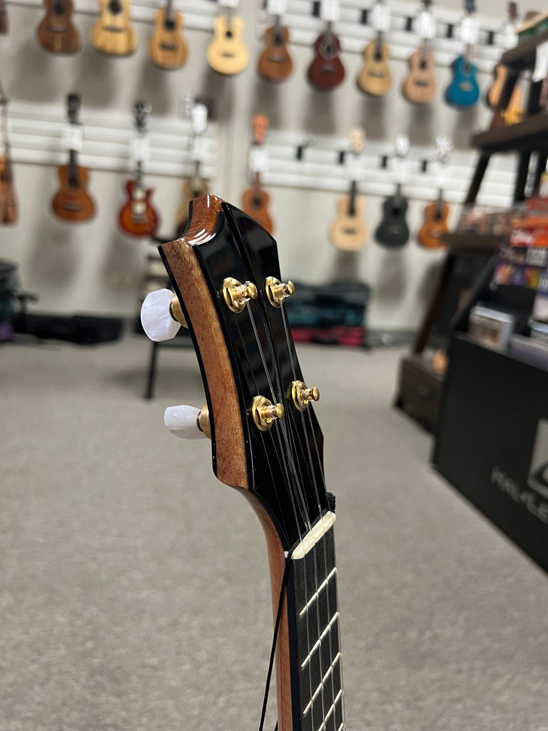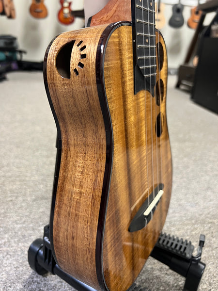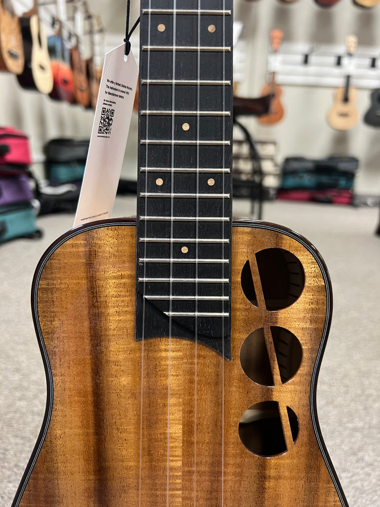 This amazing looking Rebel Ukulele features a solid acacia body to go along with the ebony bridge and fingerboard. The unique soundholes give it a very distinct look and sound. This uke produces a very lively tone that projects very well. This is a one-off limited edition uke that won't be available again. Aloha!