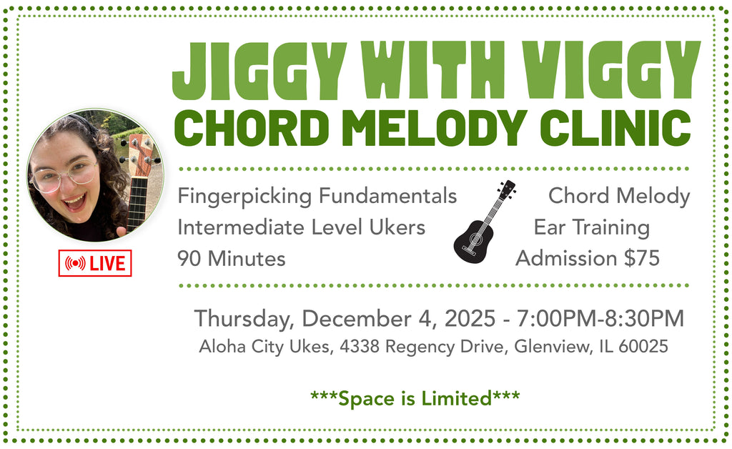 Lets get jiggy and learn fingerpicking fundamentals, chord melody and ear training together! 90 minute ukulele clinic for intermediate-level ukers.
