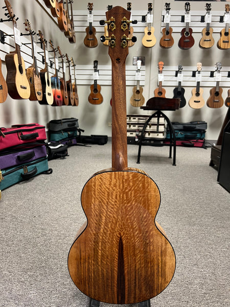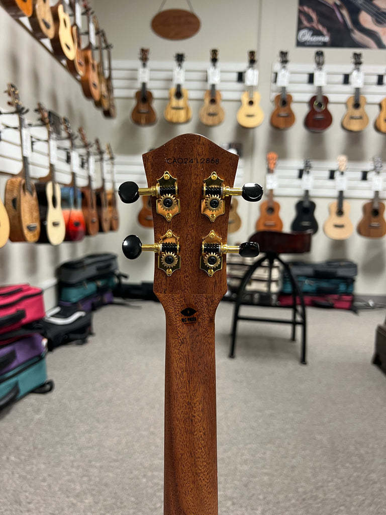 The Flight Lily steel string electric baritone ukulele is a thing of beauty. It features a solid cedar top with mango back and sides. The cedar/mango combination produces a beautiful warm and full tone and the steel strings give it an acoustic guitar type of tone. It also has a built-in pickup with the volume and tone controls discretely hidden inside the sound hole. Aloha to that!!
