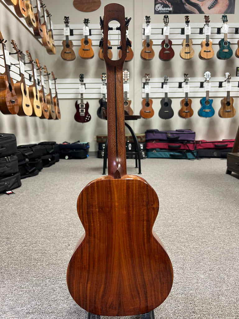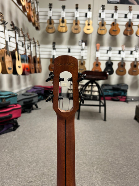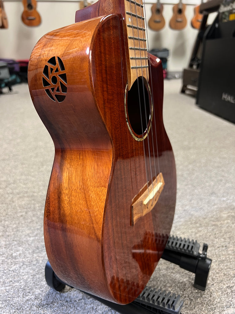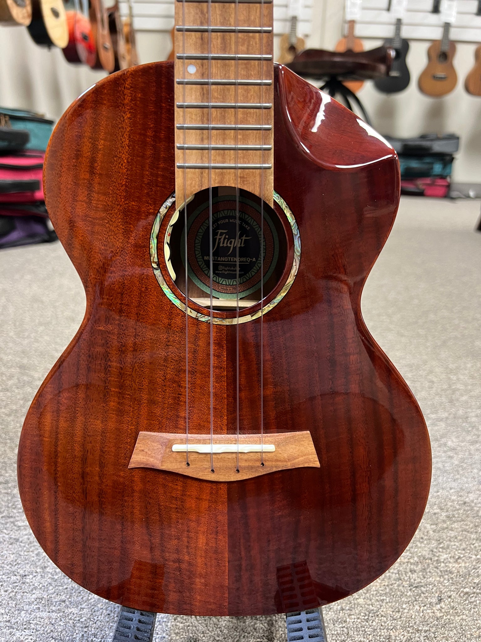 The Flight Mustang electric tenor ukulele is a thing of beauty. It features a solid acacia wood body with an ultra modern looking headstock design. It also has a scalloped cutaway for hours of easy playing. This is the electric model that has a built in pickup with the volume and tone controls discretely hidden inside the sound hole. Aloha to that!!
