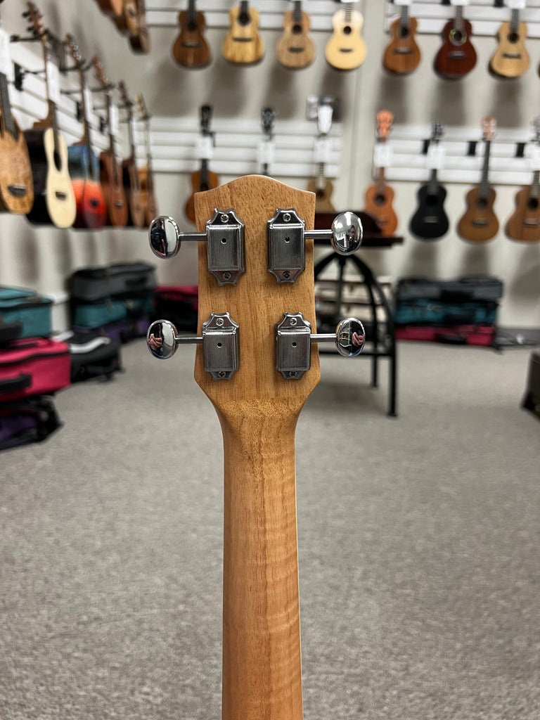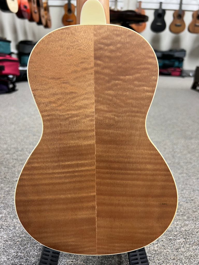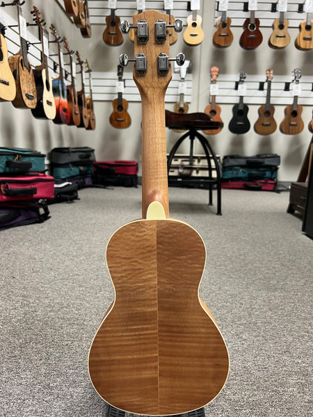 Gorgeous flamed maple wood body provides a crisp, loud tone. This concert-scale uke comes with a biscuit cone, slimline neck and upgraded tuning machines. Includes heavy-duty gig bag.
