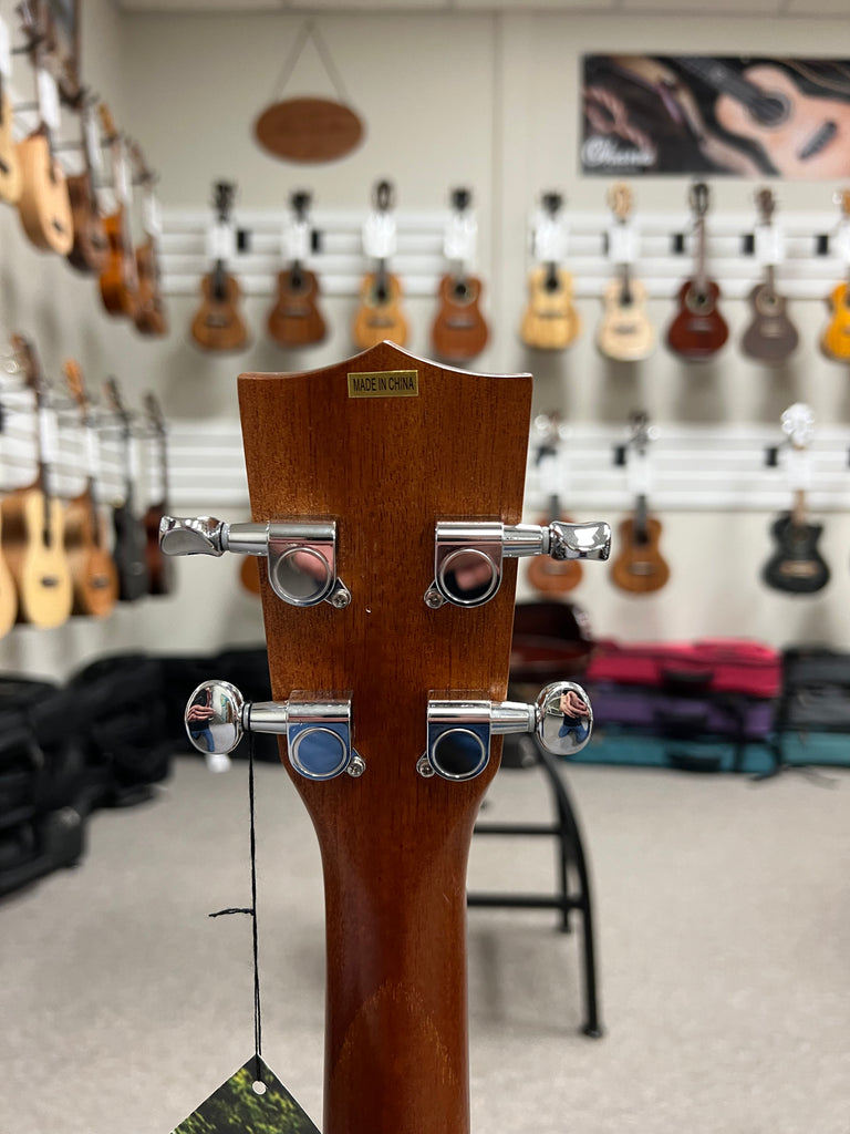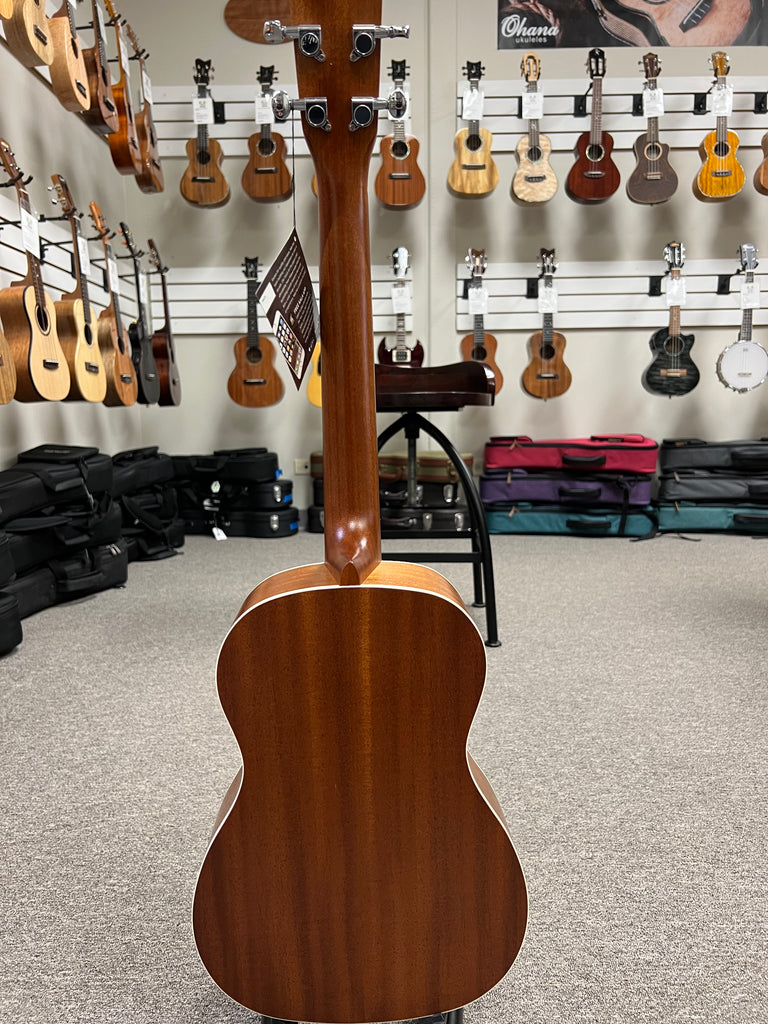 This ukulele features an all-mahogany construction, including the top, back, sides, and neck, which contributes to its warm and mellow tone. The satin finish enhances the natural beauty of the mahogany wood and allows the instrument to resonate freely. Cream-colored binding adds a touch of elegance to its traditional design. The rosewood fingerboard and bridge provide a smooth playing surface and ensure durability. The instrument is equipped with 18 silver-nickel frets and features fret position markers at the 5th, 7th, 10th, and 12th frets for easy navigation. Chrome die-cast sealed geared tuners offer precise tuning adjustments. The nut and saddle are made from Graph Tech NuBone, a synthetic material known for enhancing tone and sustain. The ukulele is strung with Aquila Super Nylgut strings, renowned for their superior tone and playability.